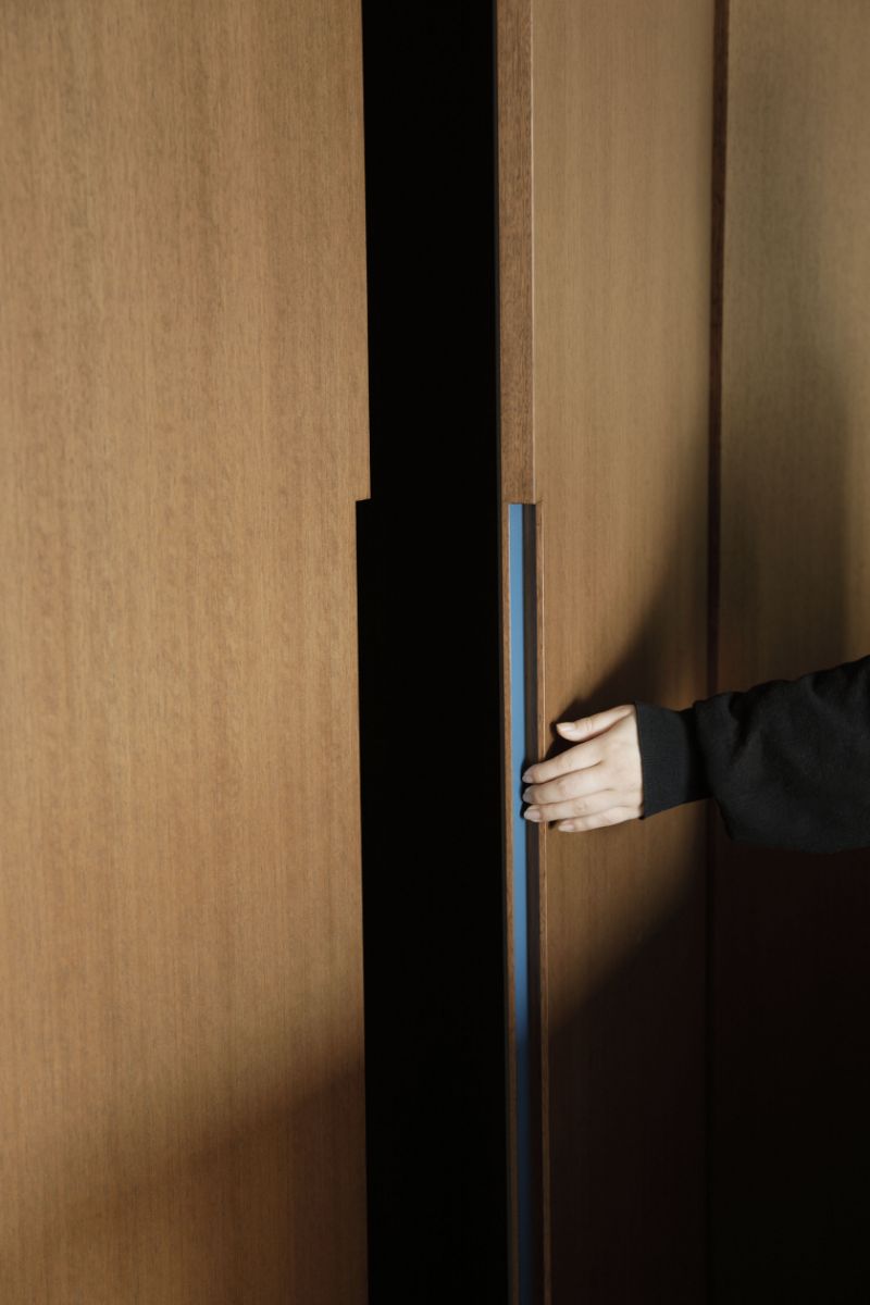 「キッチンや主寝室の収納扉の手がかり部分にも硬質なメラミン化粧板を使い、色を差し込んでいます。これも通常は板材を接着で貼るものですが、削り出した化粧板そのものをはめ込んでいます。ミリ単位のこだわりから、引き戸の取っ手も特注仕様でわずかに幅を広げたものを使用しました。このわずかな寸法の違いで手のかかりがまったく違います。先ほどお話ししたキッチンカウンター下のレザーの棚板もステッチの糸を太さや色まで指示します」