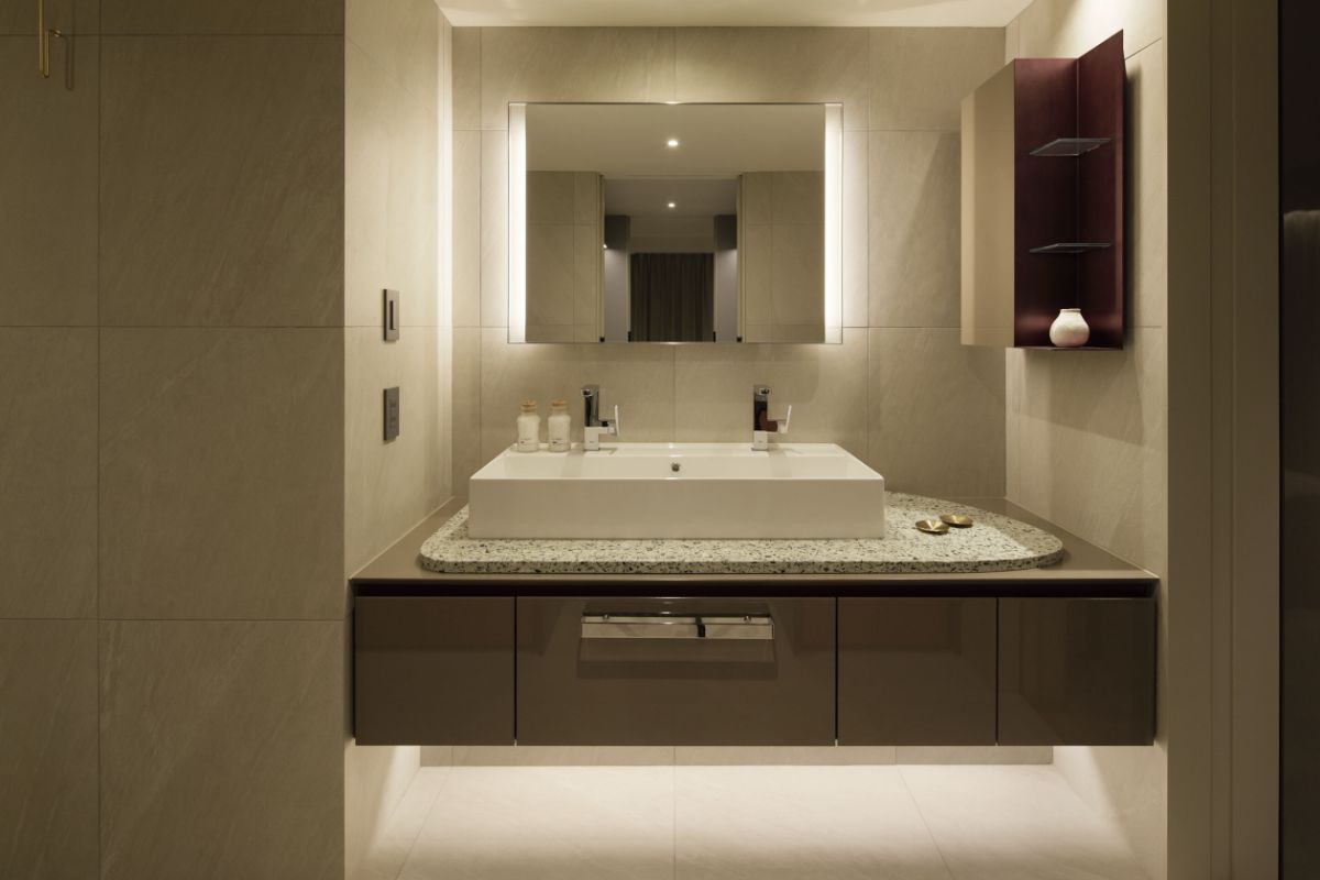 「百貨店の化粧品コーナーが心躍るように、自宅の洗面室もそうでありたいと考えました。これこそ気持ちをアップテンポにさせる要素です。デザインのわずかな操作で住み手に行動を促し、住まいをアクティブに楽しんでほしいと考えました。ハイグレードのレジデンスは、どうしても色を抑える傾向にあります。ここでは色が入ることで空間の楽しさを感じていただき、思わずなにかを飾りたくなり、色に合わせて家具を置きたくなるような動機づけを意図しています。ただこうしたカラーのアクセントが空間全体を支配しすぎてしまわないよう、細心の注意を払ってデザインしています。たとえばこの飾り棚の色はウォークインクローゼットから目にすることはありません。なぜならウォークインクローゼットは衣服が主役であり、それをきれいに見せる空間でありたい。目線をコントロールすることで各部が主張しすぎることがないようにしています。けれど一歩進むと、その色に気づく。そうした調整を細部で行いました」