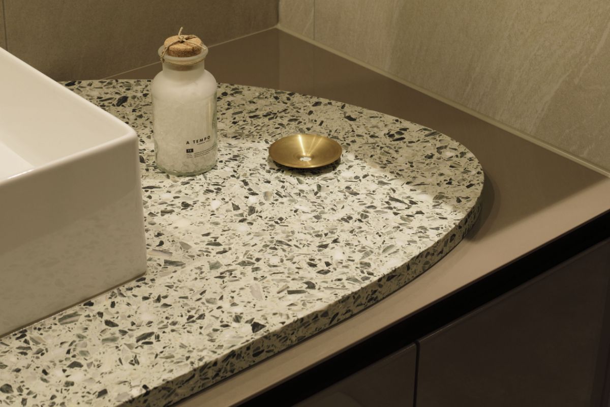 寝室から続く洗面室は日常的なアイテムを陳列する場だ。吉村はそれを受け止める洗面台のあり方も考えた。洗面ボールの下に楕円型のテラゾーの板を設置することで、そこにコップを置くだけでも様になる。飾り棚も透け感のある塗装をしたステンレスで、やはり赤い色を差し込んだ。