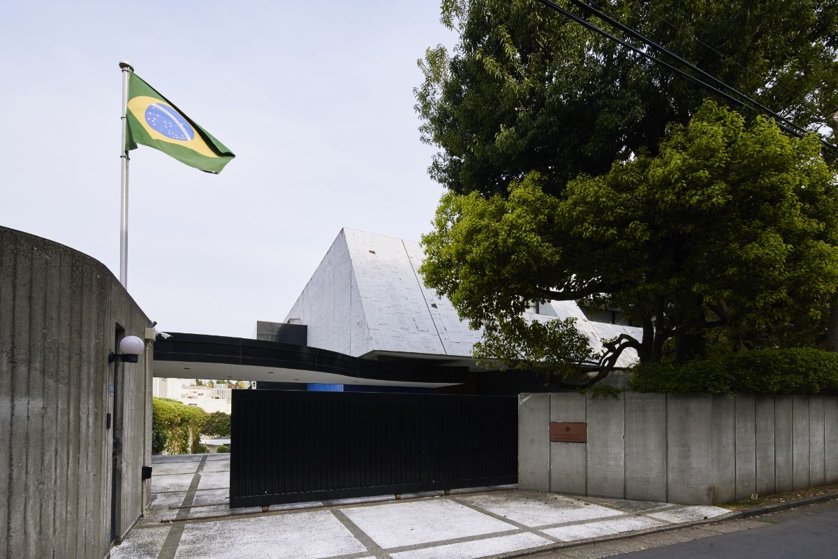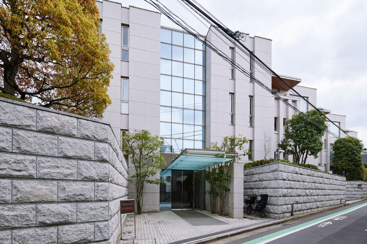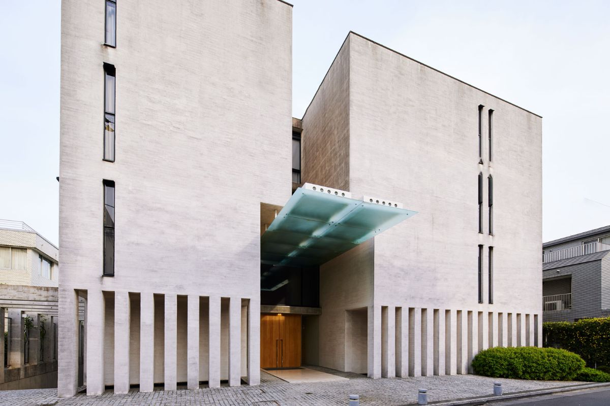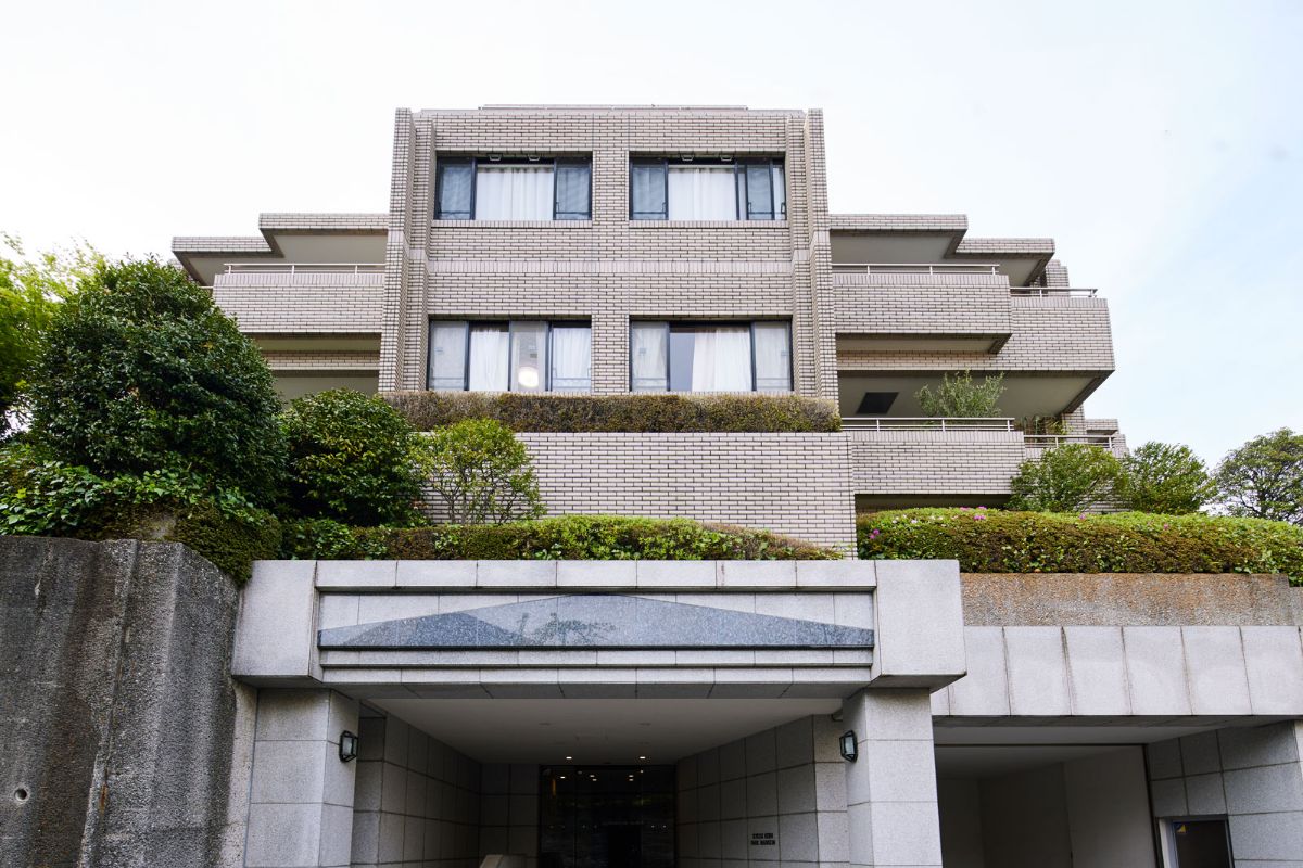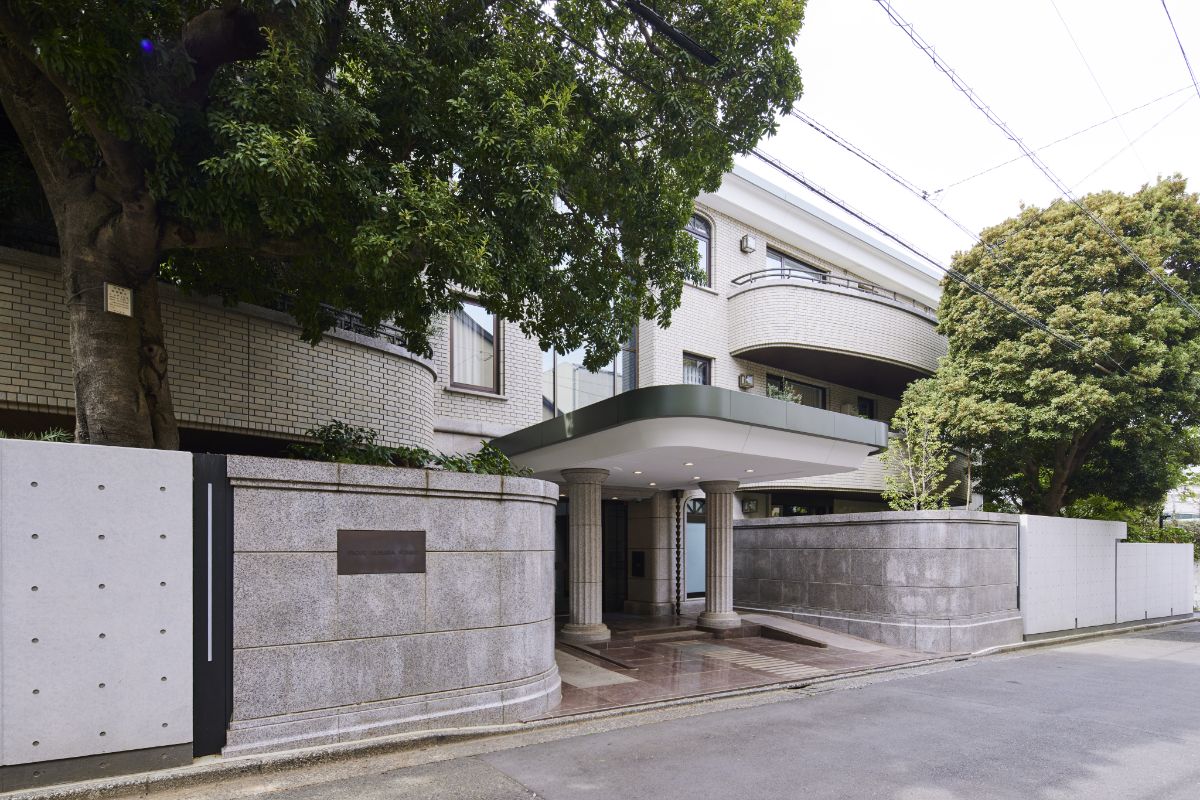 「大使館通り」に面する総戸数18戸の邸宅マンション。建築家・横河健氏のデザインで、コンクリート打ち放しの特徴的なファサードデザインが閑静な邸宅街に溶け込んでいる。