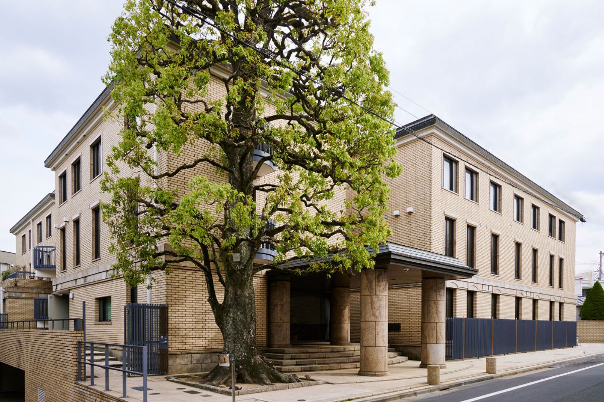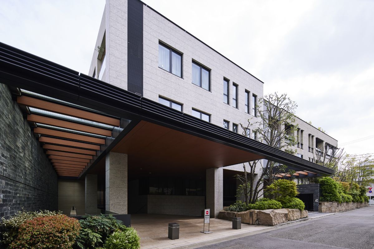 大理石や御影石を用いてデザインされた重厚感のある外観と、ガラスのキャノピーのモダンなエントランスが特徴。総戸数26戸、平均専有面積138㎡のゆとりあるプランに、メンテナンス性を考慮した配管計画など、永く暮らせる設計の配慮も魅力の邸宅マンション。