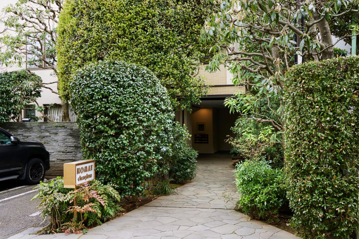 大山町の中でも徒歩5分と代々木上原駅に近く、利便性と落ち着いた暮らしの両者を享受できる総戸数19戸の邸宅マンション。外構の垣根がきれいに整備され、セキュリティを高めながら邸宅地の雰囲気を損なわない設えとなっている。