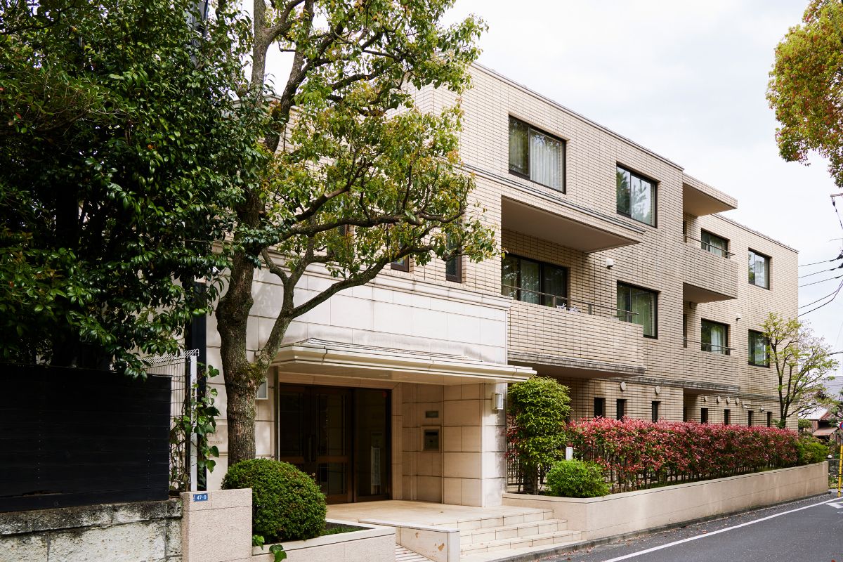 「大使館通り」のヒルトップに位置する、総戸数68戸のエリアでは比較的大規模な低層邸宅マンション。2線2駅利用可能で山手通りにもアクセスしやすく、緑豊かで閑静な住環境と利便性が両立。
