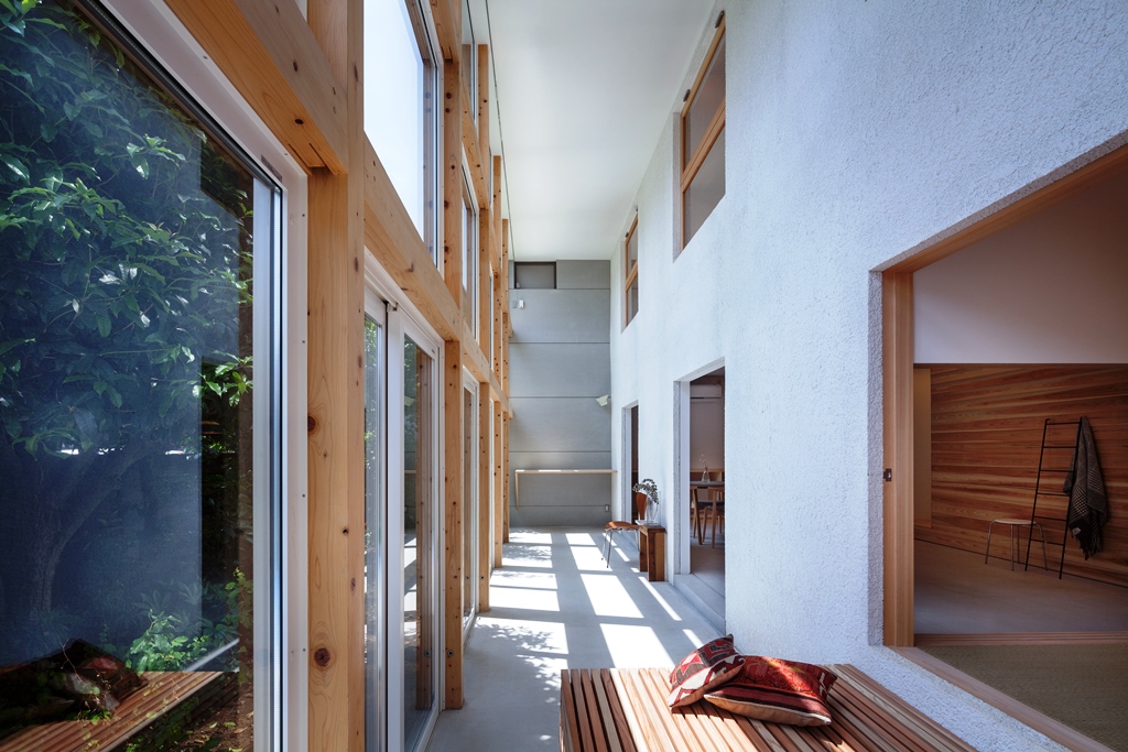 庭に面して一面ガラスを配した、白く光あふれる空間。サンルームという名前では物足りないほどの贅沢なこの空間が、中と外、そして中と中の関係性も繋ぎます。