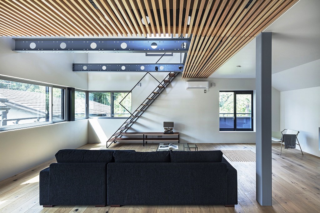 緑と歴史が垣間見れる住宅街の一画。天窓から注ぐ光と、大きく設けられた吹き抜け空間が家の中に複数の心地よい居場所をもたらしました。設計は、R100 TOKYOで絶大な人気を誇るアトリエエツコ山田悦子氏。 リビングの吹き抜け空間は、内部でありながら外部のようでもあり、光と風とここに暮らす家族の姿とが交差します。
