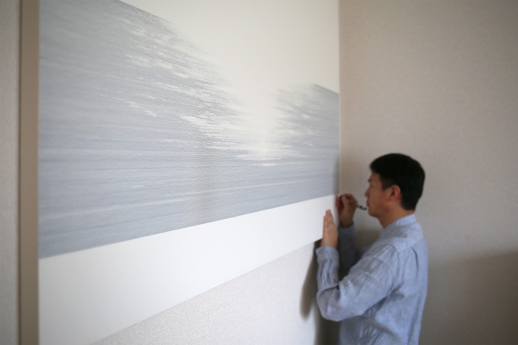 「参考にいただいた図面やパースを見ると、天井高が低めで家具も低く、日本人らしい目線の高さでの暮らしが想像できました。空間に水平方向の広がりが感じられたので、水平な線の世界からイメージを結びつけて、ここでは「線」で表現するものがふさわしいと決めたんです。さらに、内装や家具に華美な化粧が施されているわけではなく、素材そのものの良さが生きている。そんな無垢なイメージにも重なるのではと思い、リビングには「光海」を選び、ダイニングキッチンには線で構成した新作「祈海」を描こうと考えました」