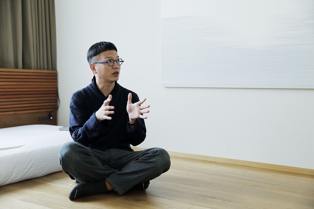 「ここは、一人でただただ絵を眺めるための空間です。泊まる人には自分の家のようにくつろいでほしかったので、なるべくホテルらしさが出ないようにしました。座ったり、寝転がったりしているときにも絵を楽しんでもらえればと思って、絵は低い位置に飾っています。このホテルはもともと病院だった建物をリノベーションしているので「癒し」の空間をイメージし、ハーブを使った特別な「ハーブコーディアル」を、広島にアトリエを持つANITYAさんに依頼して作ってもらいました。香りは僕がいつもアトリエに置いているサンタマリアノヴェッラのポプリ、ピアノのBGMは音楽家の橋本秀幸さんがこの企画のために作曲・演奏してくれたものなんです」