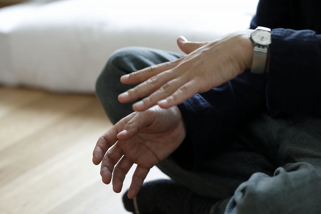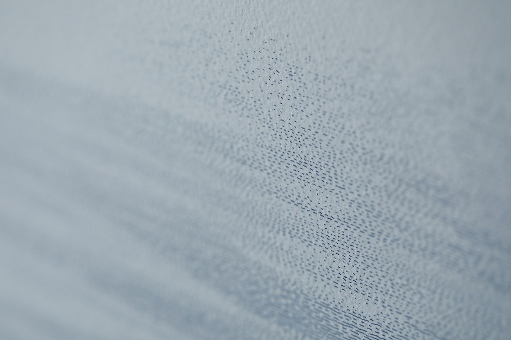 「無意識になれと言われても難しく、どうしたらいいのかと考えていると、昔見た蚕が桑の葉を食べる様子が思い浮かびました。上から下へと順番に食べて端まで行くと、また上に戻って下へと同じ方向で食べる。その様子をイメージして無心で線を引いてみました。そのときは点線から始めたんです。紙の端から点線を描き始め、一列描き終わったら二列目の端に戻って同じ方向に点線を引く。最初はなかなか難しく、もちろん曲がったり歪んだりもするので、その度にショックを受けていました。でも、できるだけ気にしないようにして何本もの線を描いてみたんです。それであるとき、それらの線を一歩引いて見てみたら、まるで海が揺らいでいるように見えたんですよ。だから最初は「海を描こう」と思ったわけではなく、できたものがたまたま海に見えただけなんです」