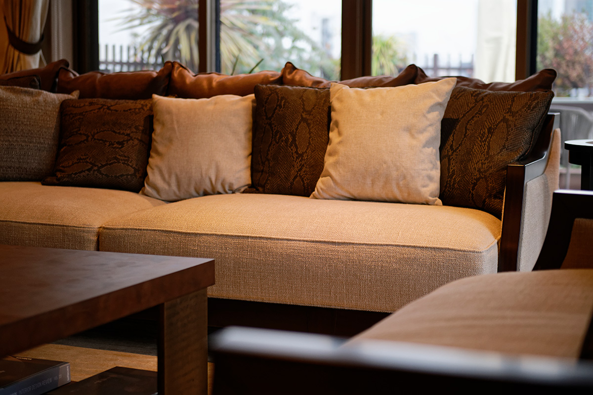 麻は、人間が初めて布をつくったときに用いられた素材であるとされており、古来日本人の生活を支えてきた。伊勢神宮の神礼の「神宮大麻」の由来となった植物で、藍、紅花とともに三草とされる神聖なもの。また麻布という地名は、麻を多く植えて布をつくっていたことに縁(ゆか)るという。そのことからもコマタさんは、麻が現代の人々の望む「CASUALUXE(カジュアルでリラックスできる良質なもの)」にかなう価値ある素材と考え、上質な麻をこの住宅の家具やファブリックに用いることを提案した。