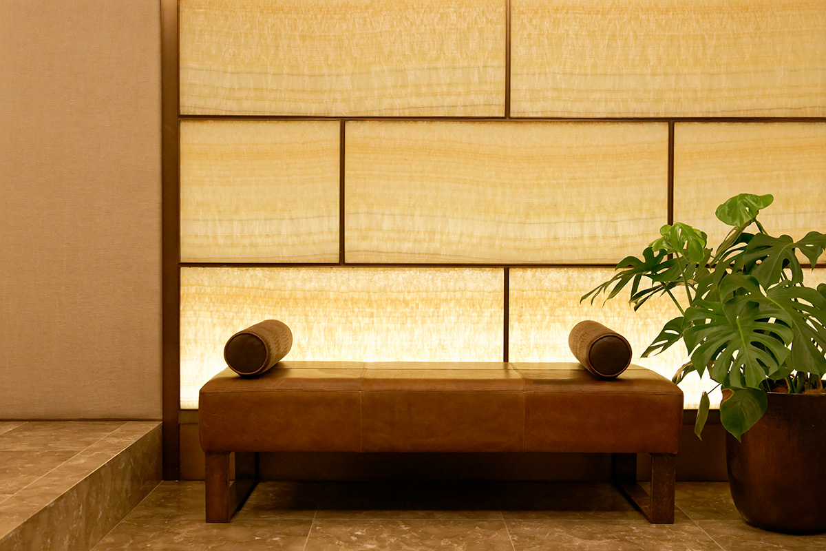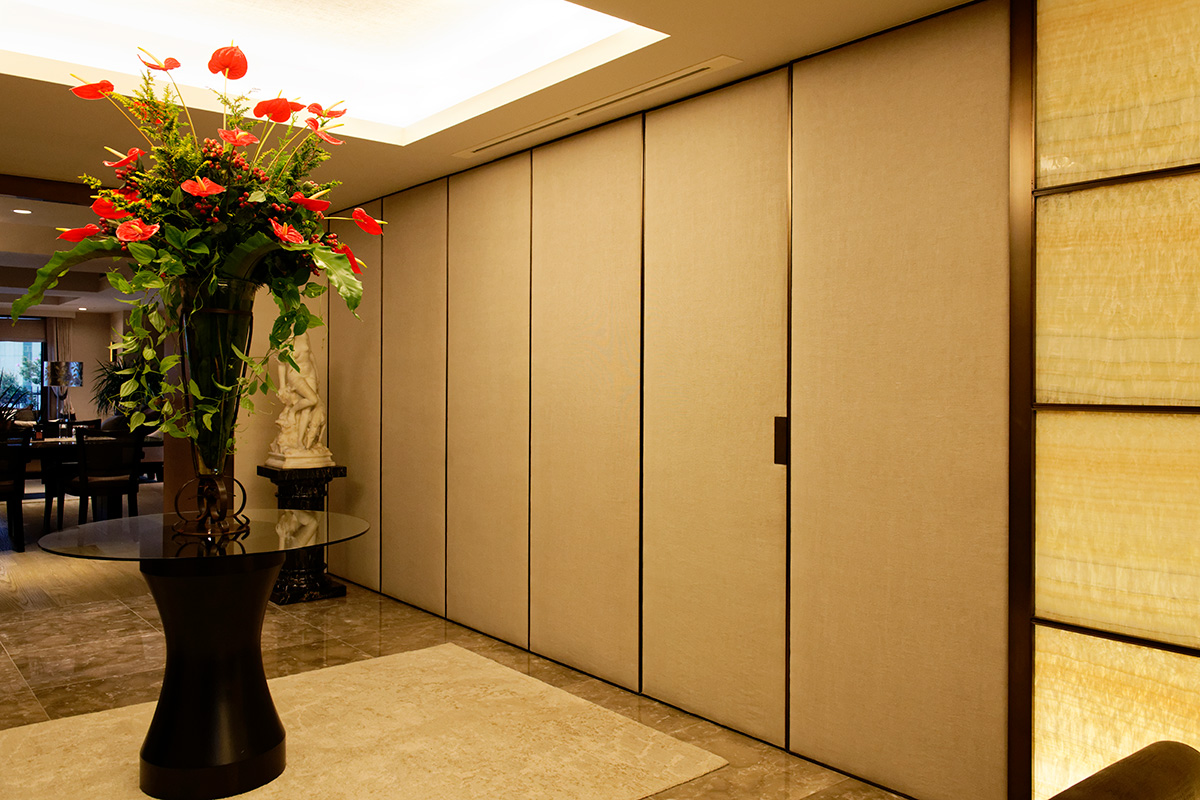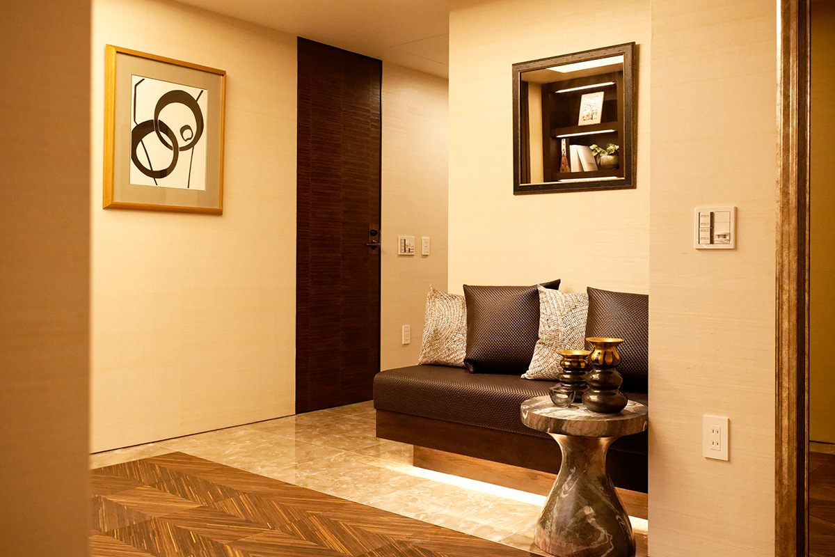 エントランスは大理石とオニキスに彩られ、人を迎えるのには十分なスペース。どんす張りの仕切りも優しい雰囲気だ。もともと交友関係の多いCさんは、この場所に親しい人々が集う日を心待ちにしているという。