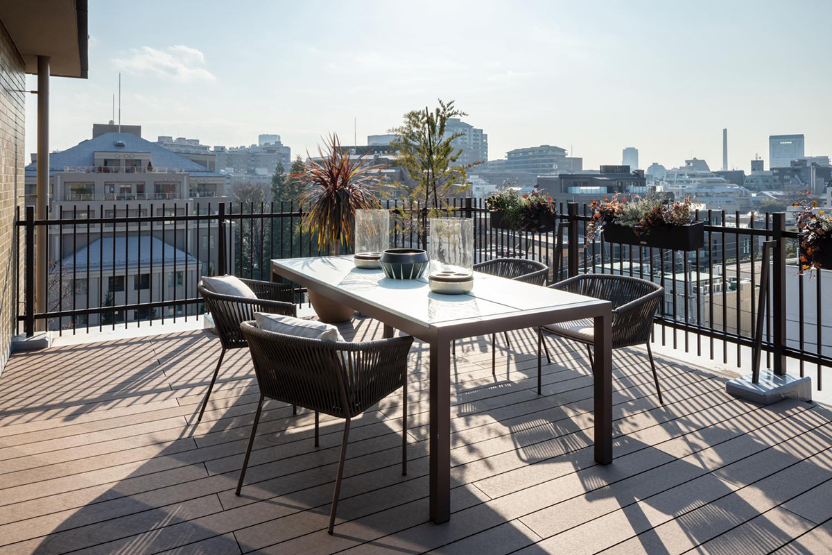 「近くには緑豊かな公園もありますし、この子にとっても毎日の散歩が楽しみのようですよ。田園調布の住まいのそばには大きな街道が通っていたので、かえってこちらのほうが静かな印象があります。歩いて15分程度のところにカフェやお店があるので便利ですが、今はお友達とお茶をするのもランチをするのも我が家のバルコニーでどうかしら? という感じで、お家時間を堪能しております。外出してもすぐに帰宅したくなるほどです(笑)」