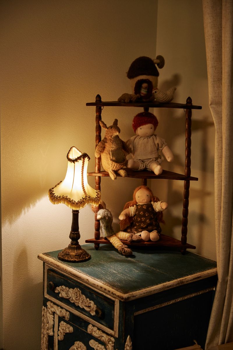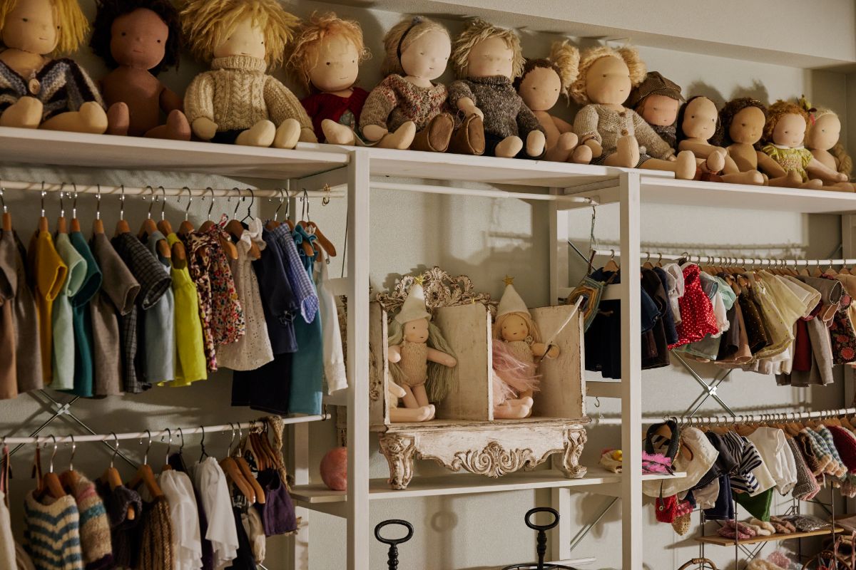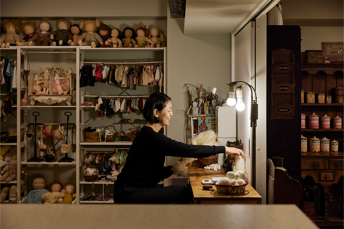 そこに温かみをプラスするのが、妻が手仕事でつくった人形作品。ときには羊毛から糸を紡いでパーツをつくることもあり、洋服も一つひとつ丁寧につくられた人形が、ところどころに飾られている。これらの人形もまた一点ものであり、アンティークの雰囲気にしっくりとなじみ、居心地も良さそうに優しい雰囲気へと空間を彩る。シンプルながら表情のある壁・天井、床の素材感は、Kさん夫妻のそれぞれの好きなものと調和しながら、抜群のセンスをより一層輝かせている。
