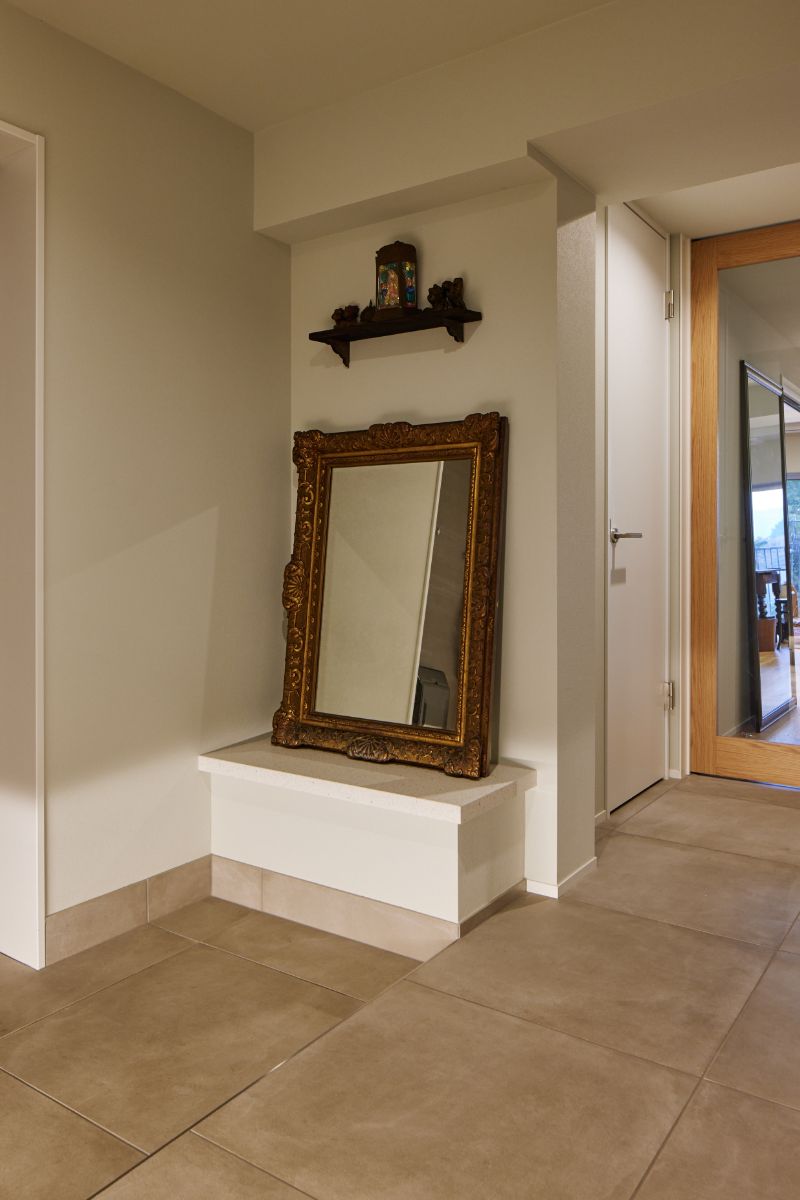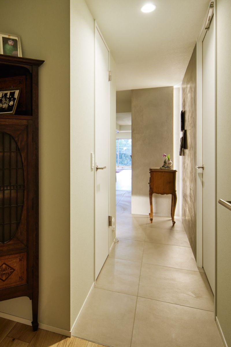 さらに、玄関とホールの壁にはモールテックスというモルタル調の塗り壁で仕上げられ、居室とのコントラストが効いている。このモールテックスの壁も「グリーンの壁とのミックス感にグッときた」という夫。