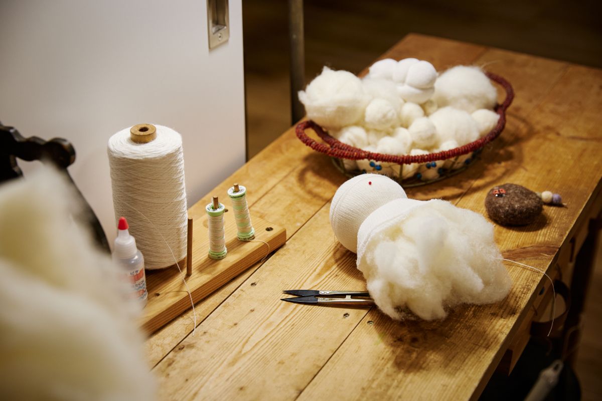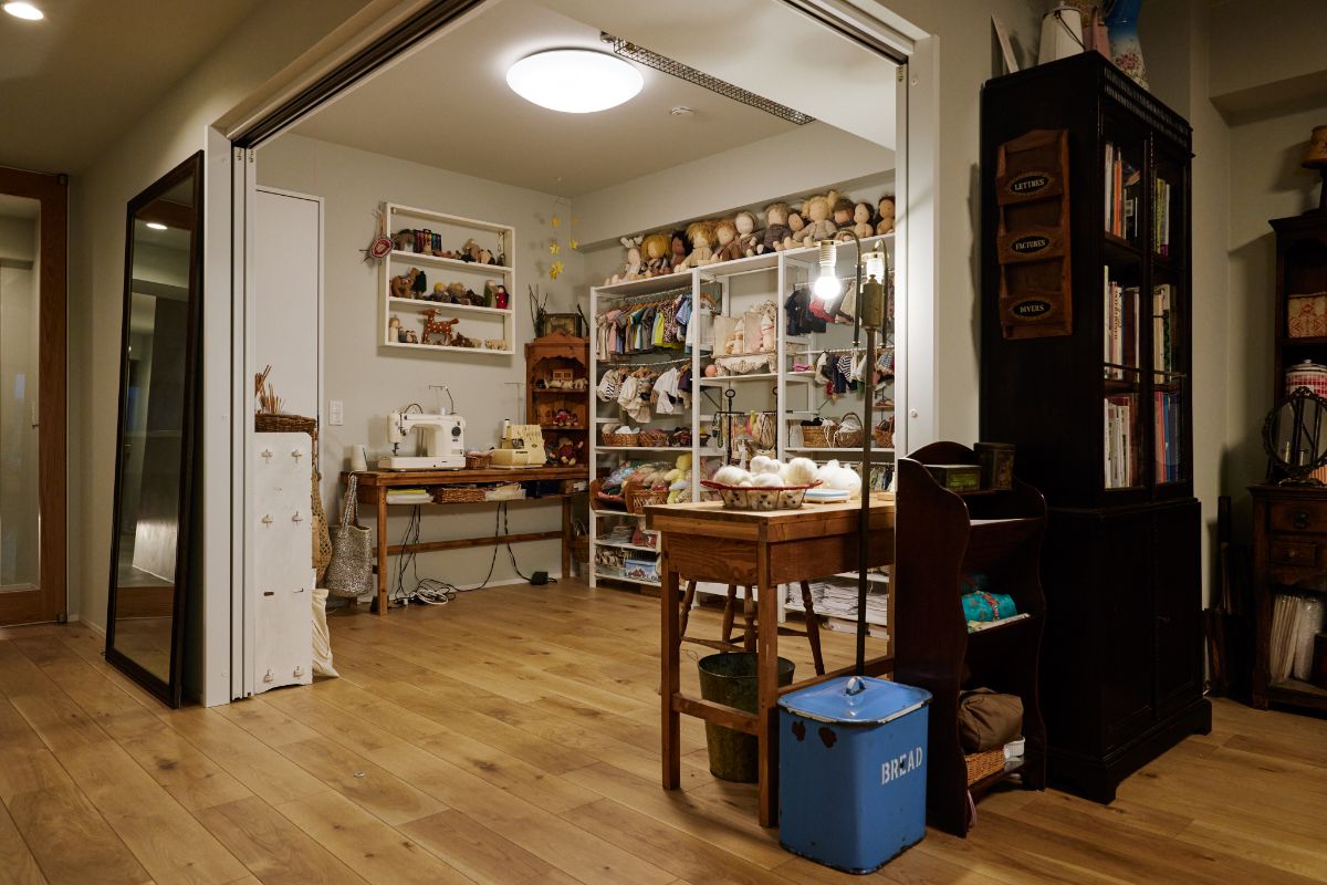 「ほとんど引戸を開け放して使っています。リビングに家族がいるときも家族の気配を感じながら作業できるし、キッチンとも行き来しやすいから便利なんです。自宅で人形づくりや草木染めなど、手仕事を楽しんでもらう教室を開催しているのですが、生徒さんにはダイニングで作業をしてもらいます。赤ちゃんや小さなお子さまと一緒に参加をご希望される方もいるから、広いリビングを有効に活用できています」(妻)