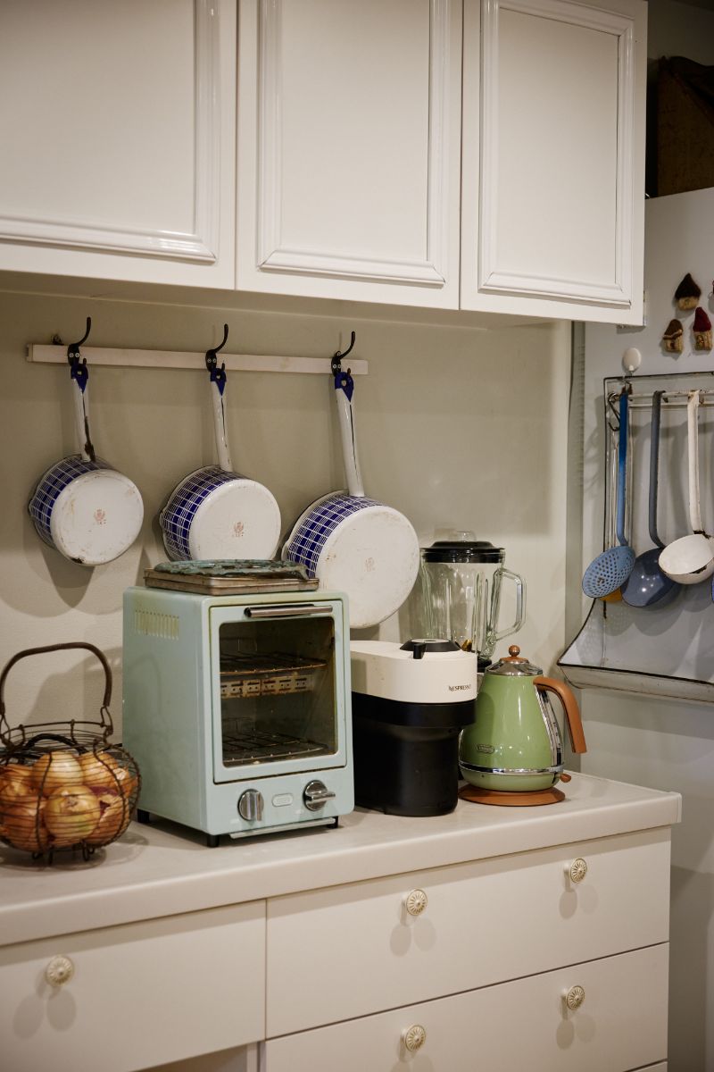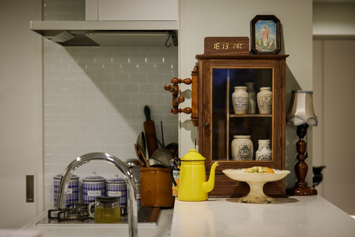 家具だけではなく、住まいの設えにも少しずつ手を加えはじめている。キッチンの引き出しの取っ手をアンティーク調のものに付け替え、吊り戸棚の扉やオープン棚の枠にモールディング風のフレームを貼り、コンロ近くの壁にはタイルシートを貼った。シンプルだった仕上げがKさん夫妻の好みに近づき、全体的な空間に違和感なく個性がプラスされている。