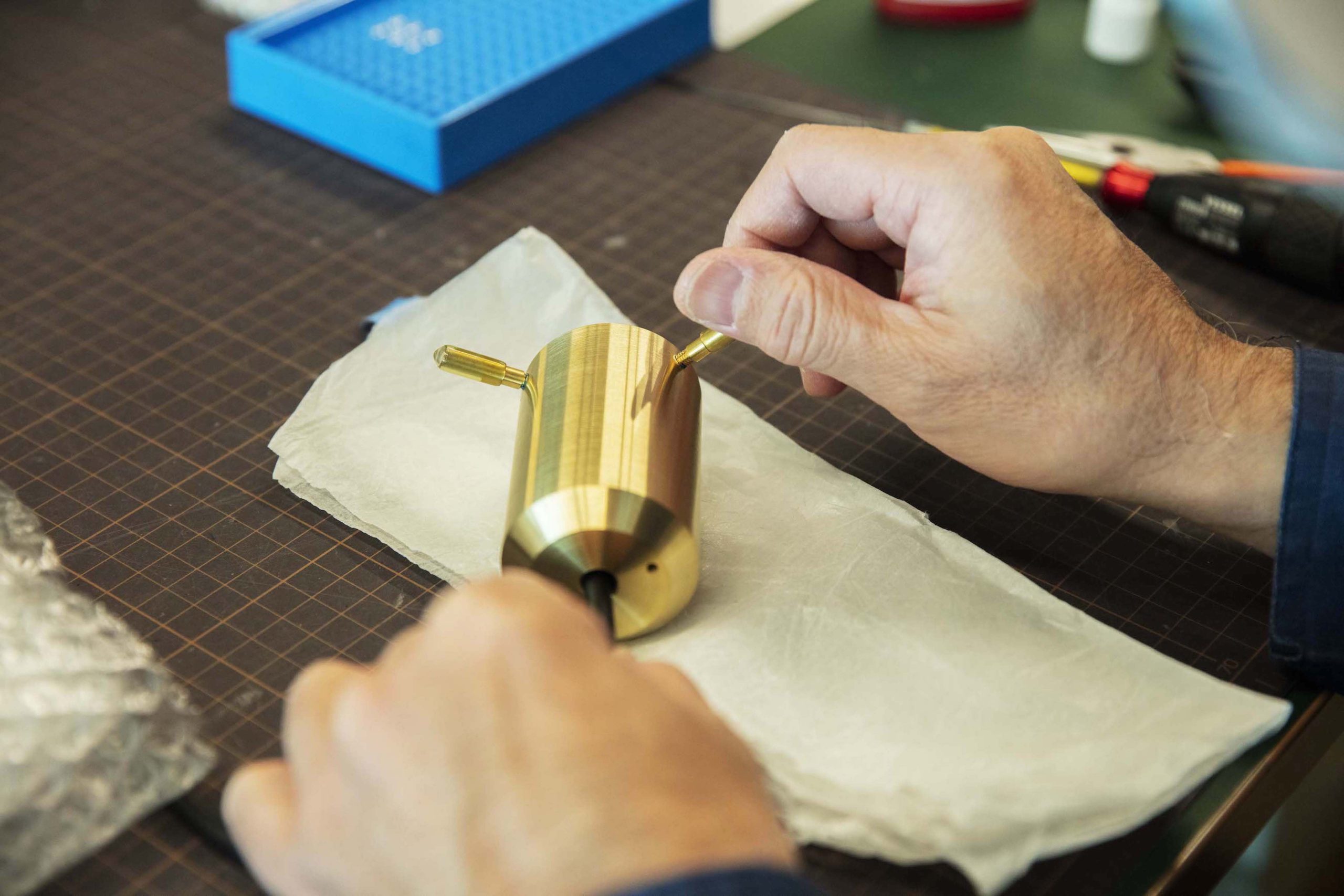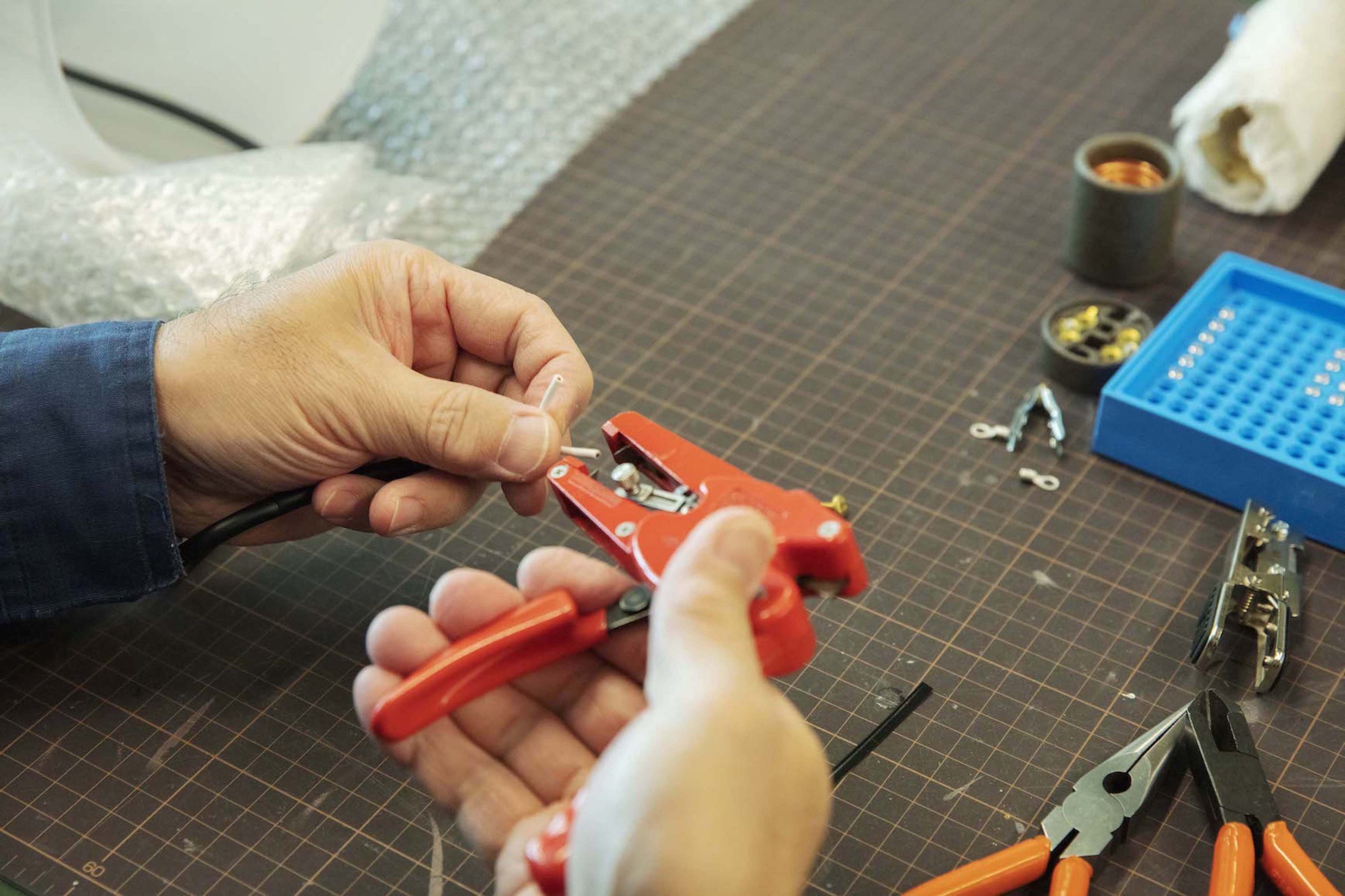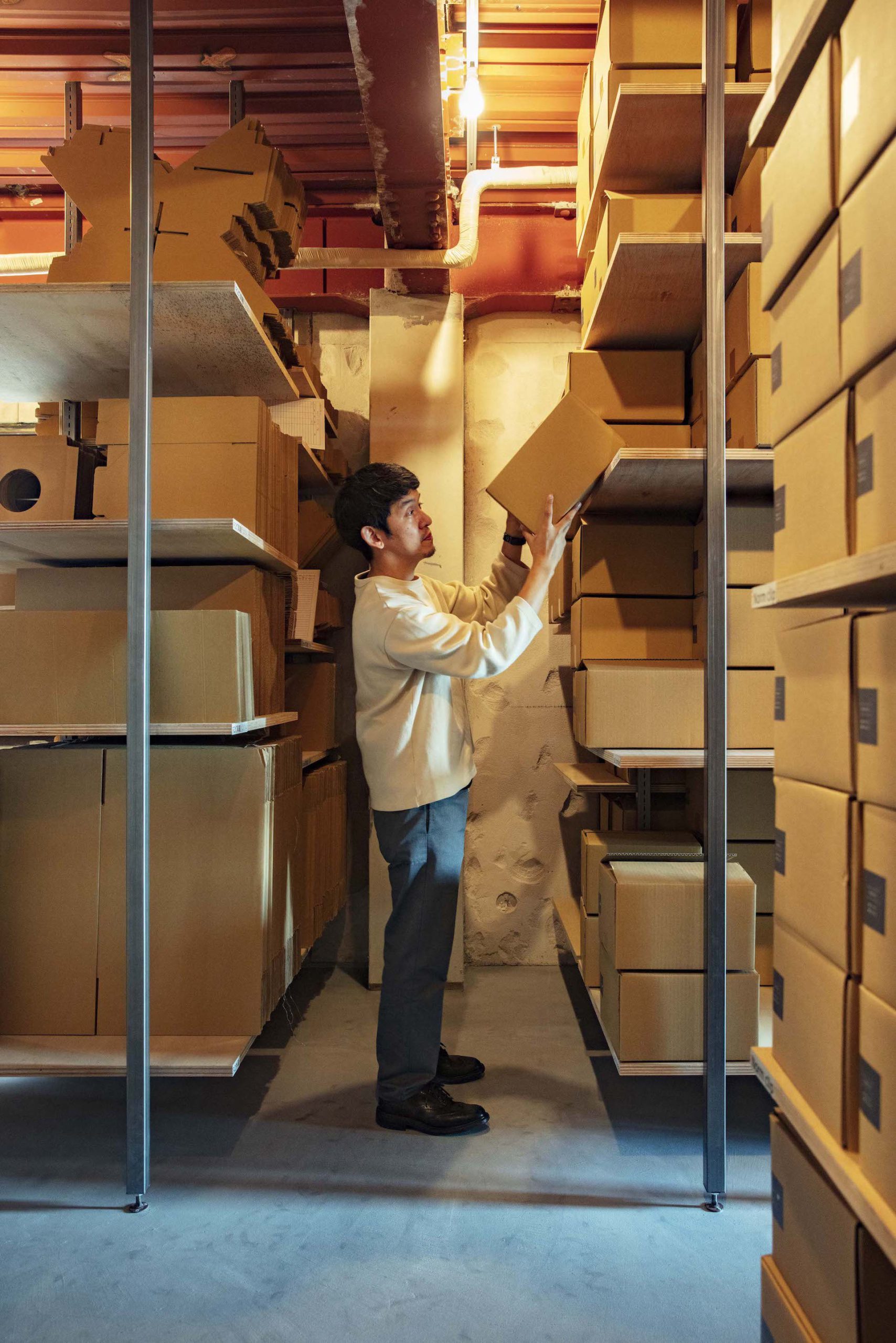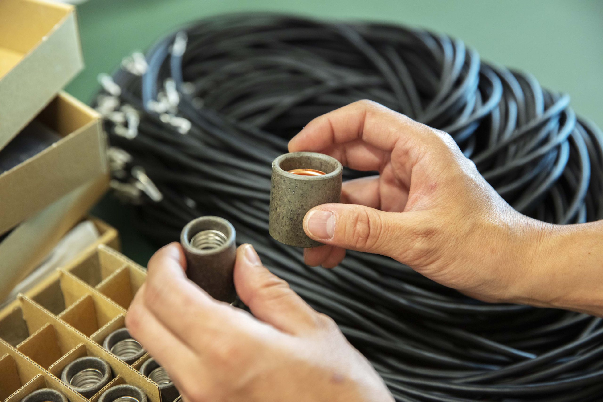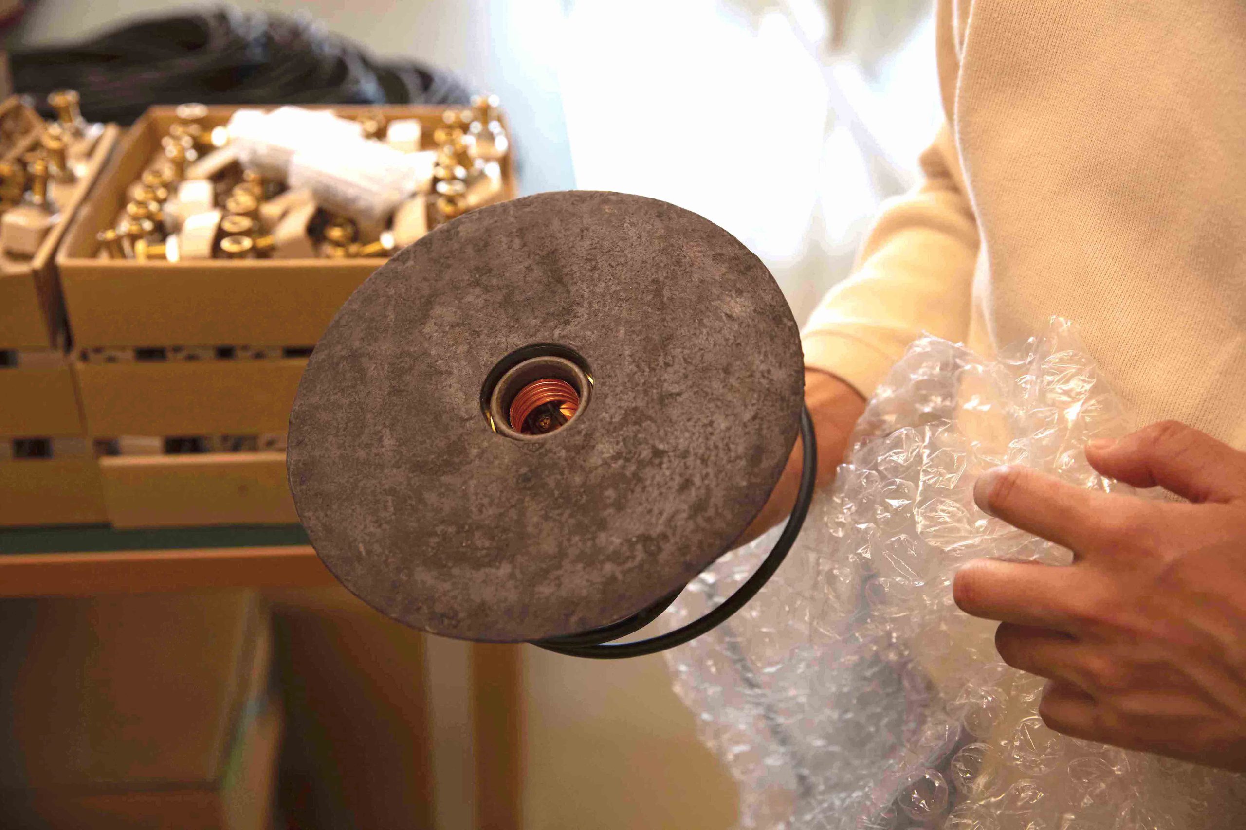壁面の棚にはパーツが入ったたくさんの箱が並び、アイテムごとにパーツを取り出して組み立てていく。真鍮のように扱いが難しい素材も多く、オーダーに合わせてコードの長さを変える工程があったりと、作業には経験が必要だ。照明器具は電気を使うものだが、その製造には手作業が欠かせない。現在はふたりの職人がフルタイムで仕事している。杉の無垢板を組んだ棚は、ニューヨークのドナルド・ジャッドのアトリエを参考にしているという。そこに黒いボックスがずらりと並んだ様子はなかなかの壮観だ。