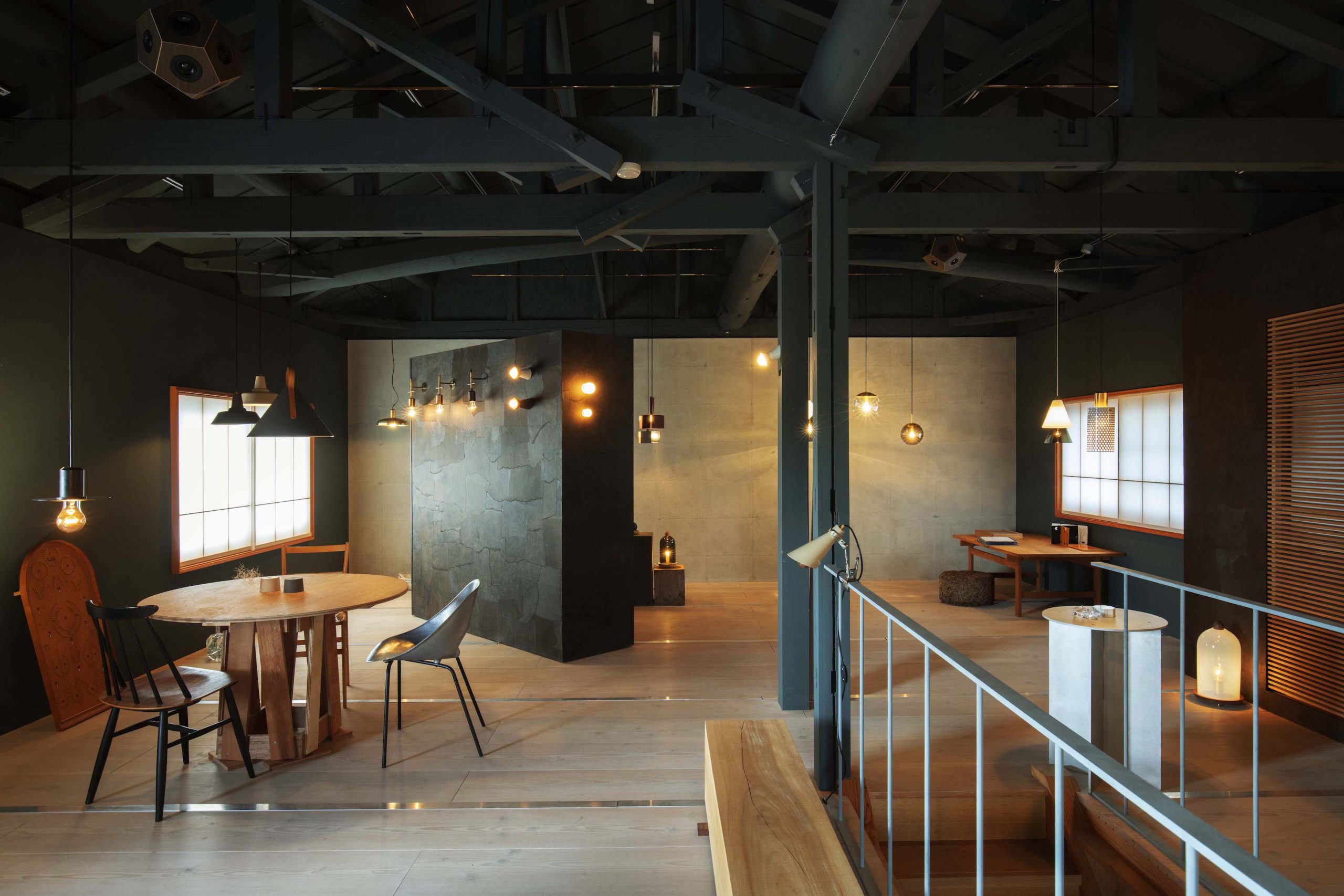 New Light Potteryのギャラリーは、奈良市・平城京跡の広々とした平地に面して立つ、築50年ほどの日本家屋をリノベーションした建物だ。照明器具のショールームのイメージとは異なり、自然光の入る吹き抜けのスペースではいくつものペンダントライトが目を引く。さらに2階は色調が一変し、濃色を背景にNew Light Potteryのほとんどのコレクションが展示されている。