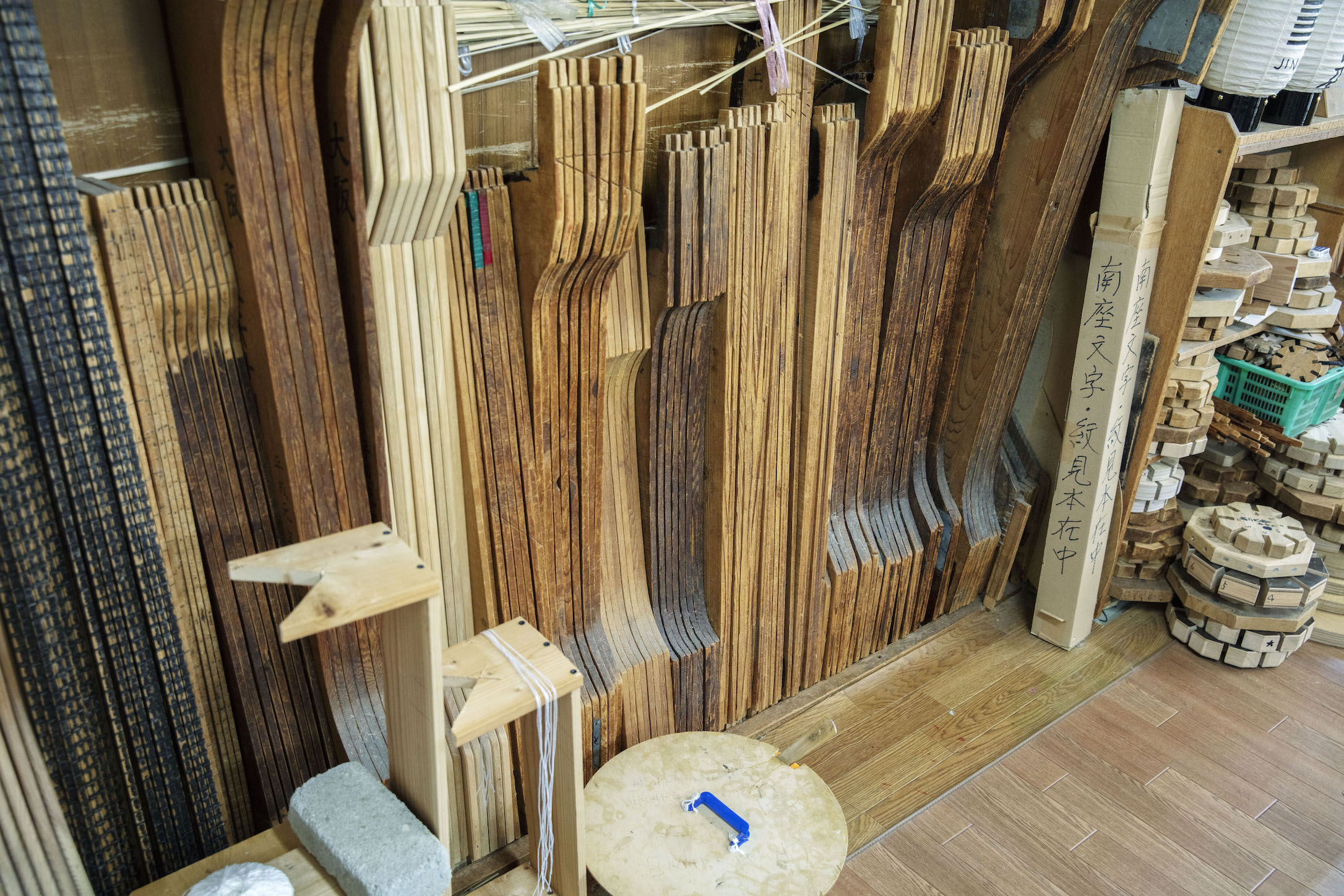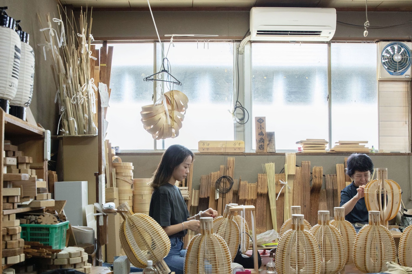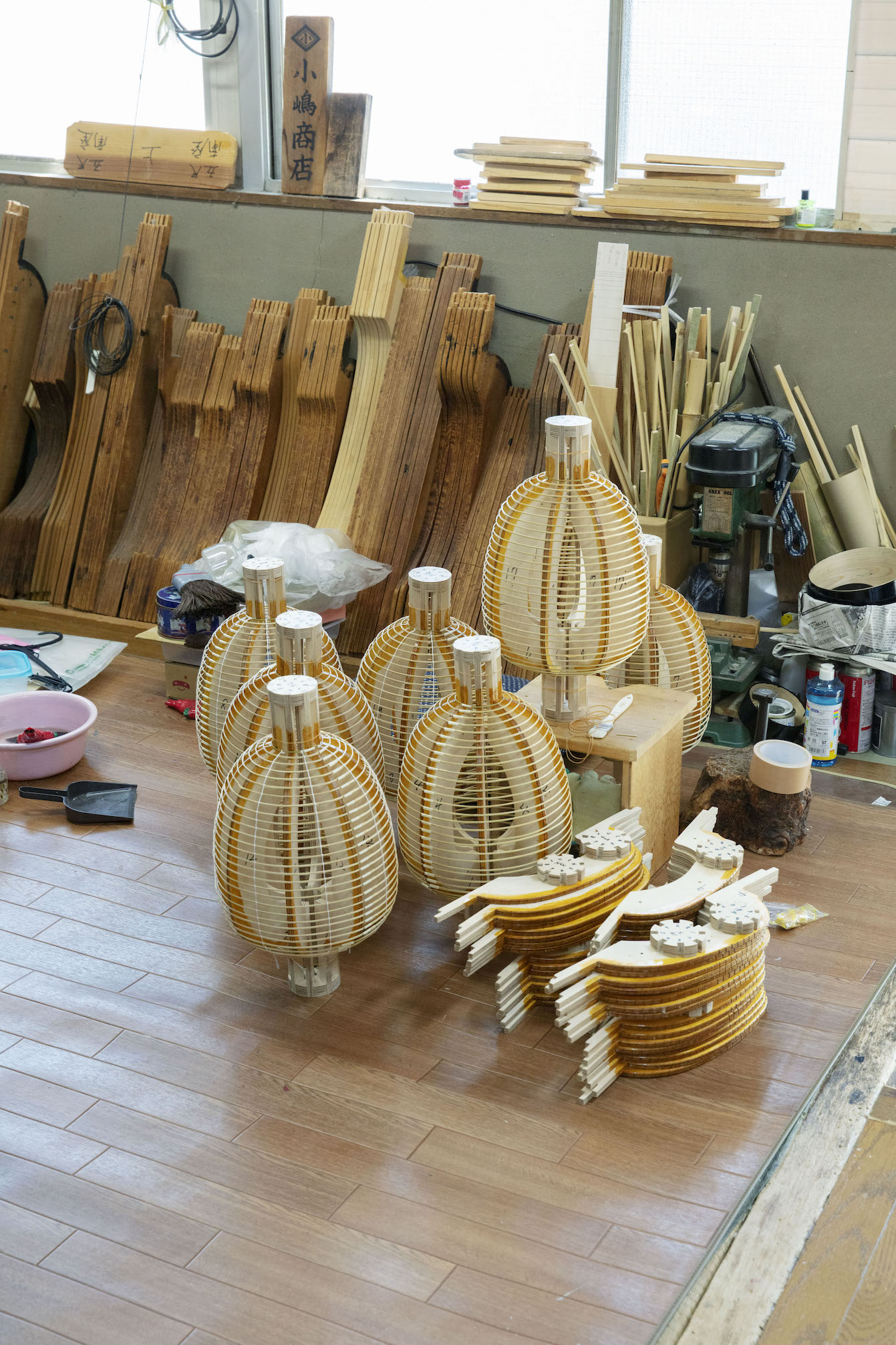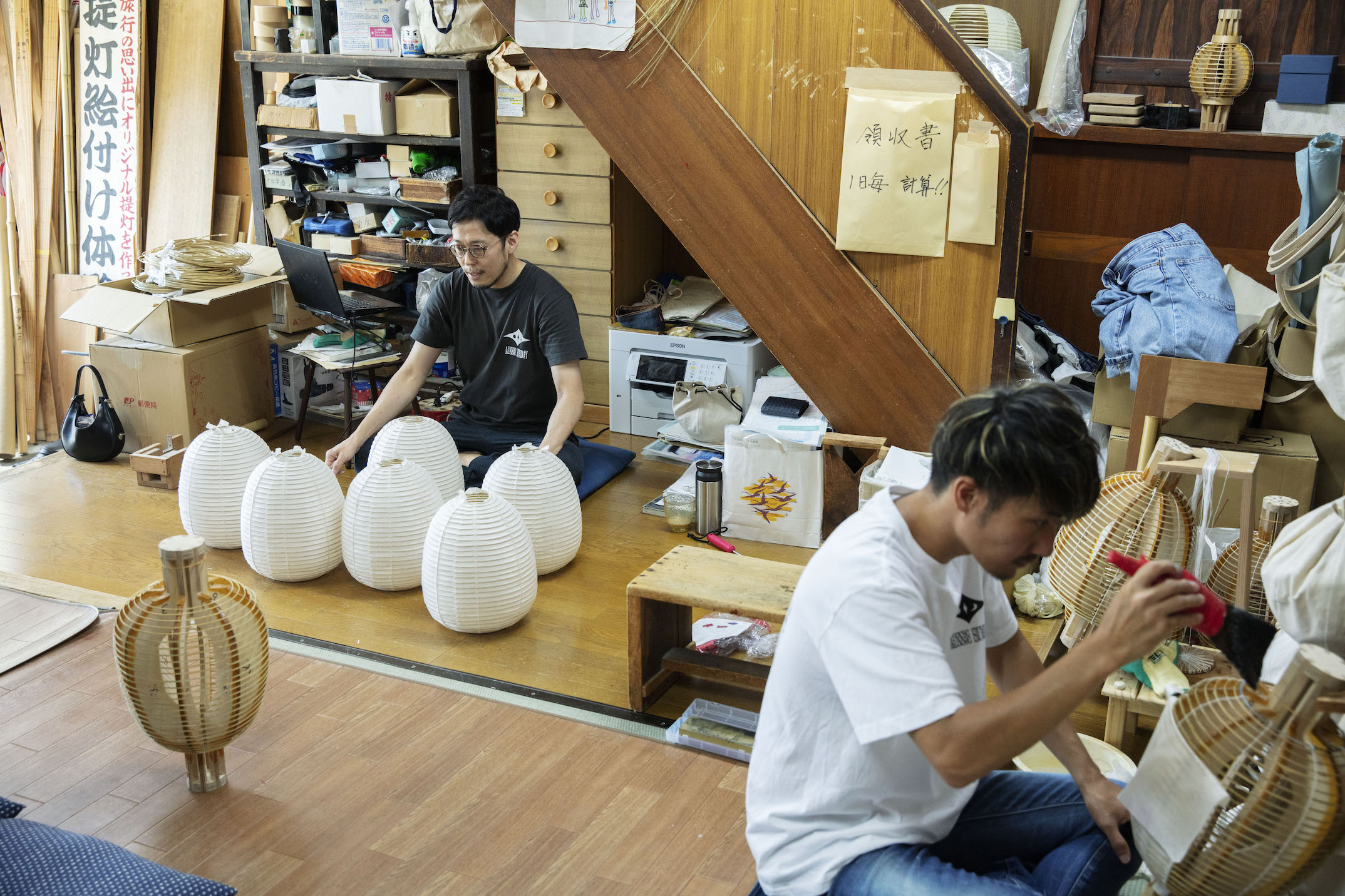 京都の「小嶋商店」は、江戸時代中期を過ぎた寛政年間(1789〜1801年)に創業。当時の屋号は小菱屋忠兵衛で、提灯を持ち運ぶ際に必要な「道具」(提灯を吊っておくための黒塗りの持ち手)を当初はつくっていた。やがて幅広い用途の提灯を手がけ、問屋としての業務も担いながら、現在まで活動を続ける。工房で主に作業するのは10代目にあたる小嶋 諒さんの夫妻と、9代目の小嶋 護さんら4名程度。諒さんの兄の俊さんも京丹後市網野で竹割りの工程に携わっている。また小嶋兄弟の友人だった武田真哉さんが、外国との取引やマネジメント全般を担当する。