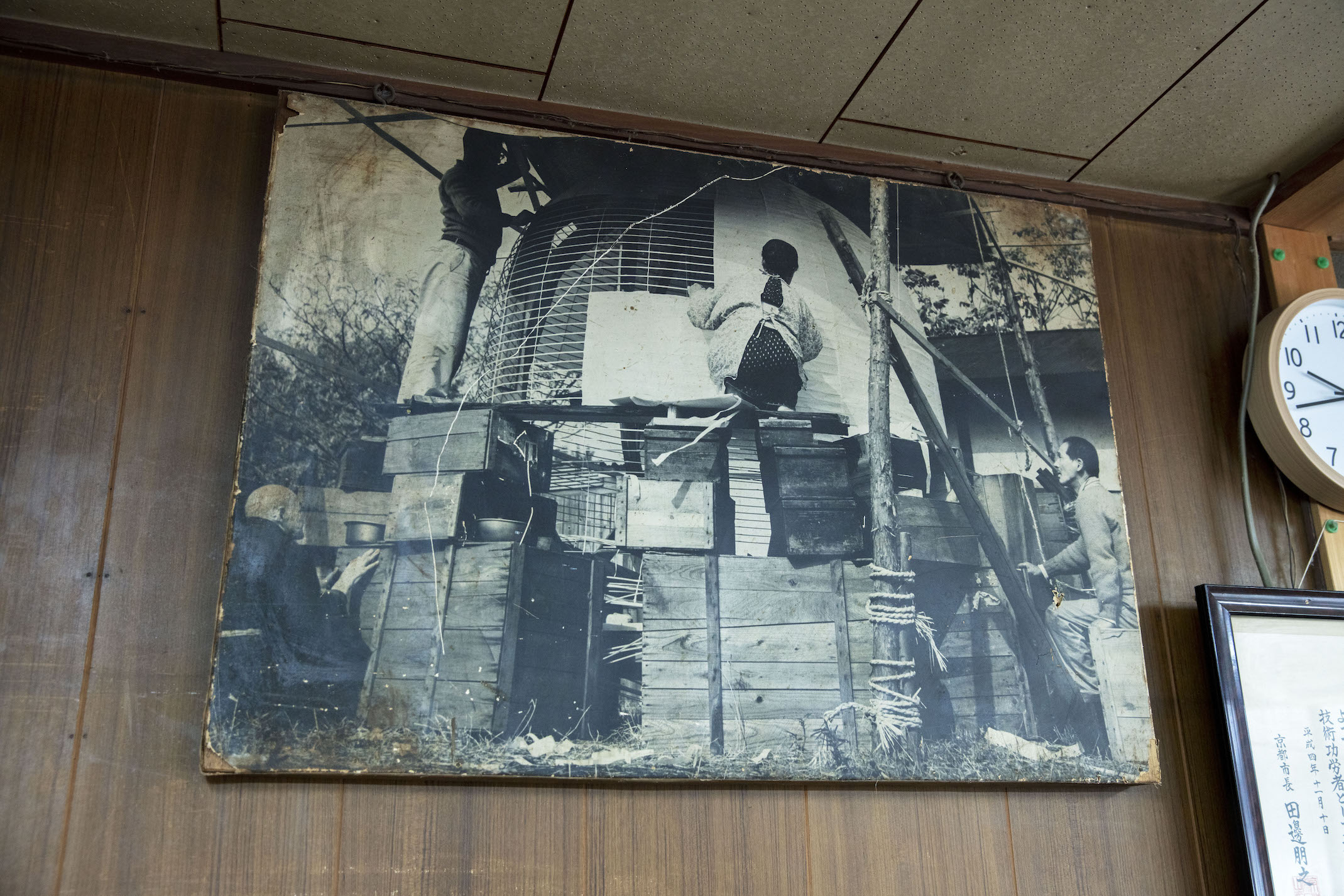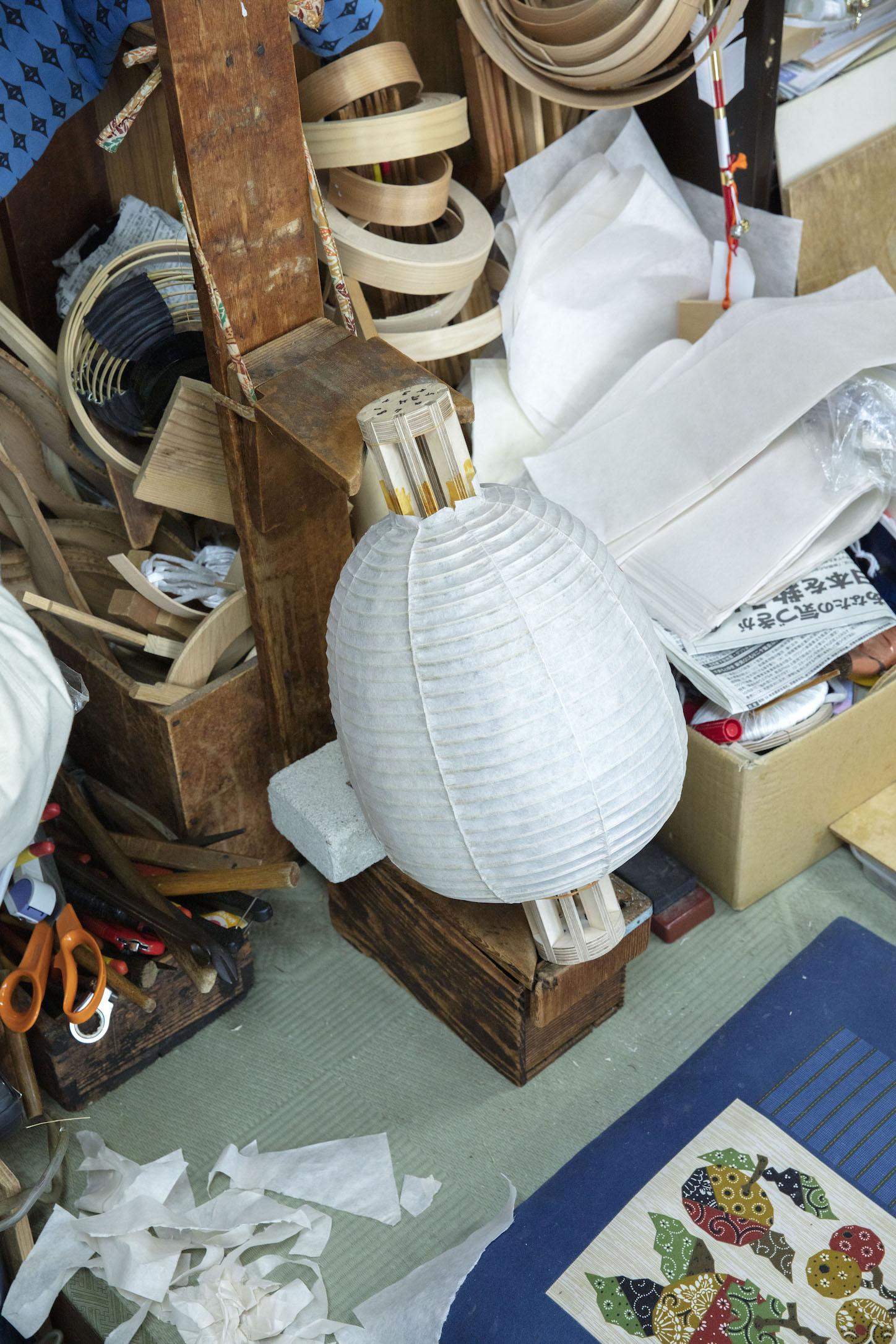 約60年前の白黒写真には、現在の小嶋商店があるのと同じ場所で、直径2m以上の大型の提灯をつくる様子が写っている。即興的にこしらえた雨よけの下、箱を積み上げた足場に登った職人たちが和紙を貼りつけているところだ。この提灯は完成後、問屋を通して海外に送られたという。提灯づくりの主な素材は、竹、木、和紙、小麦粉を原料とする糊で、江戸時代から現在までほとんど同じ。伝統的な日用品のなかでも、ここまで製造工程が変わらないものは珍しいだろう。