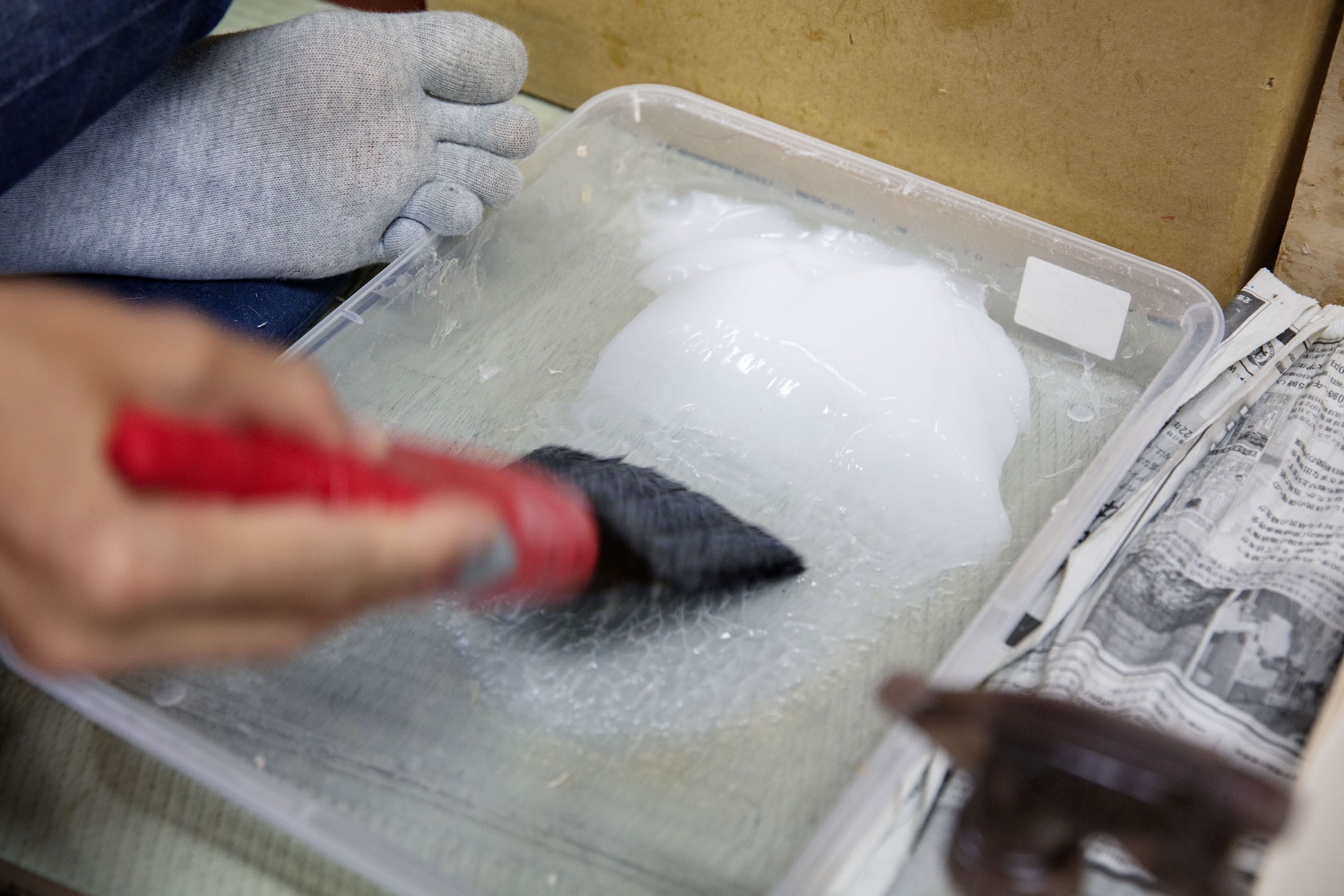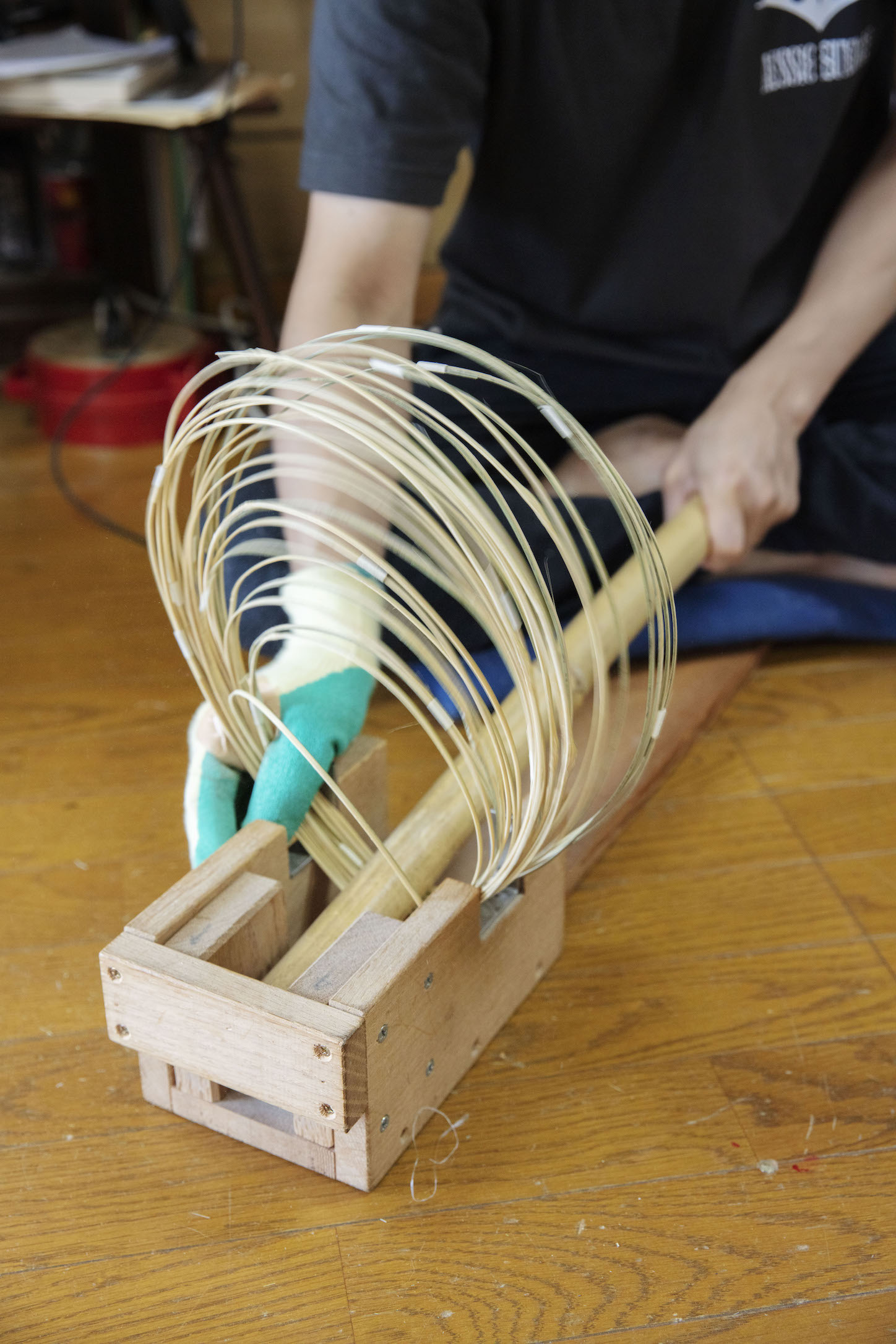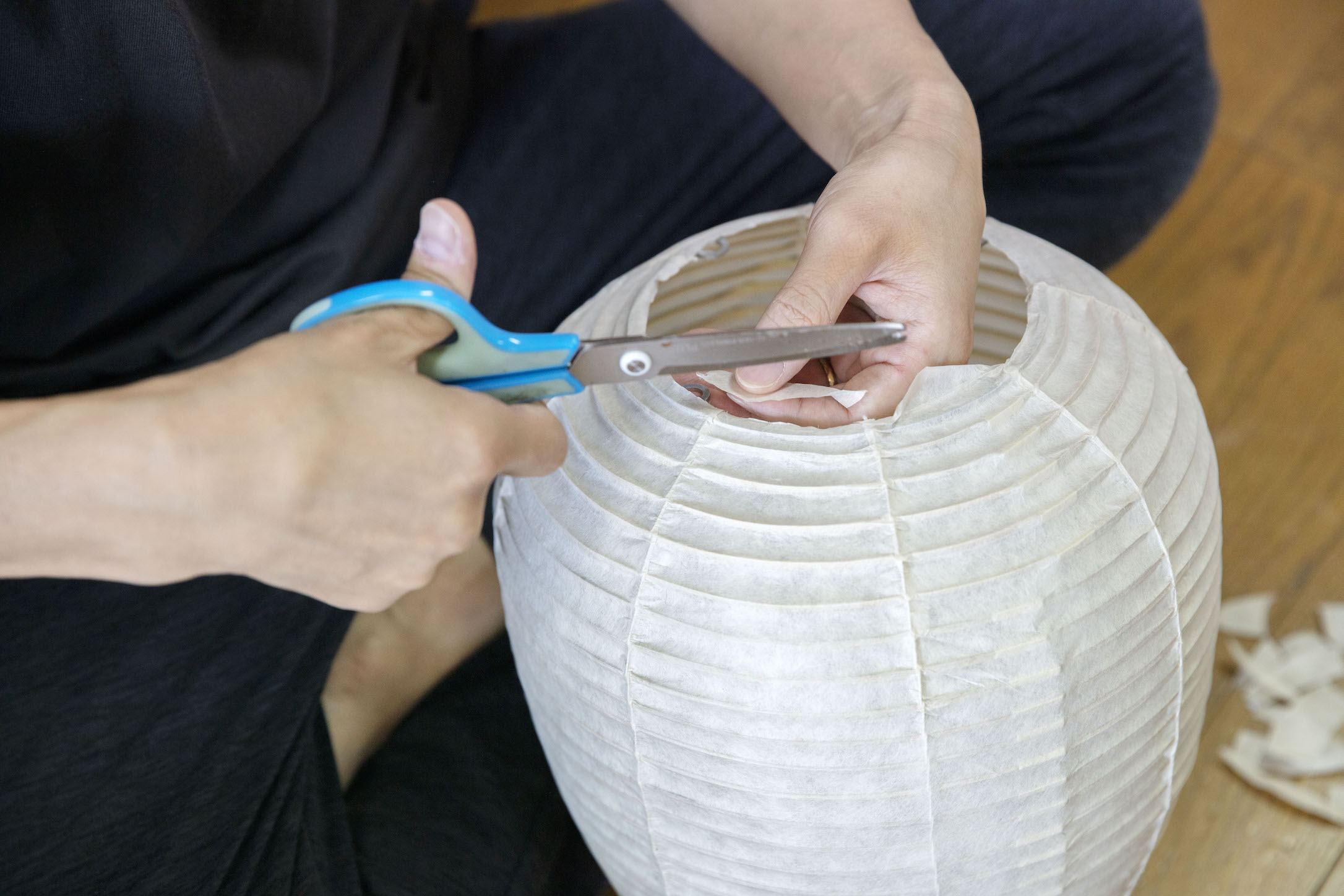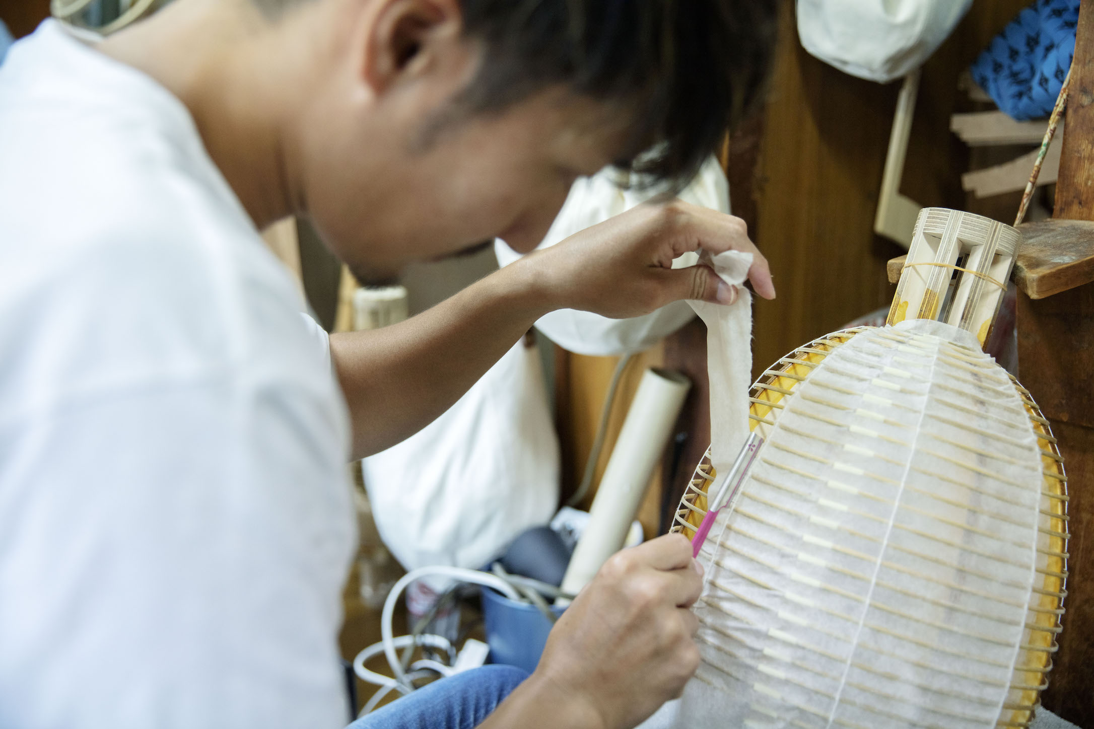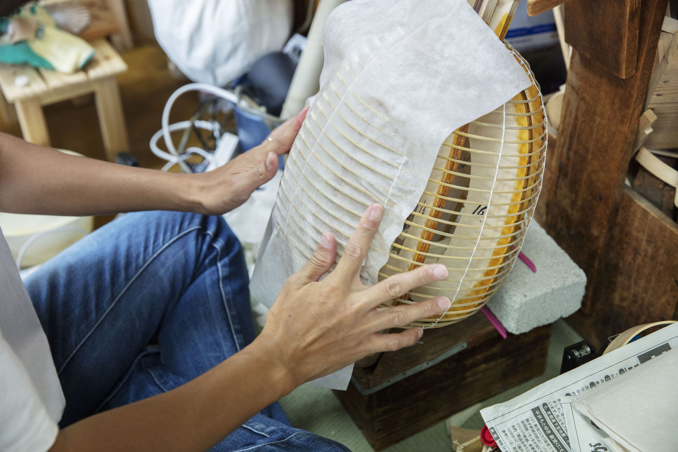 野生の竹を均一に割いていく「竹割り」に始まり、その竹で円環をつくる「骨巻き」、円環を真円に近づける「骨ため」、木型に輪を並べていく「骨かけ」、骨を1本ずつ糸でまつる「糸つり」などの工程を経て、小嶋諒さんが主に行うのは「紙貼り」。提灯のサイズに合わせた和紙を、糊で骨組みに貼っていく。その後、必要に応じて「絵付け」をしたり、持ち手をつける「道具打ち」をすることもある。ほぼ10工程に及ぶ一連の作業で最も難しいのは何か、諒さんに尋ねた。
