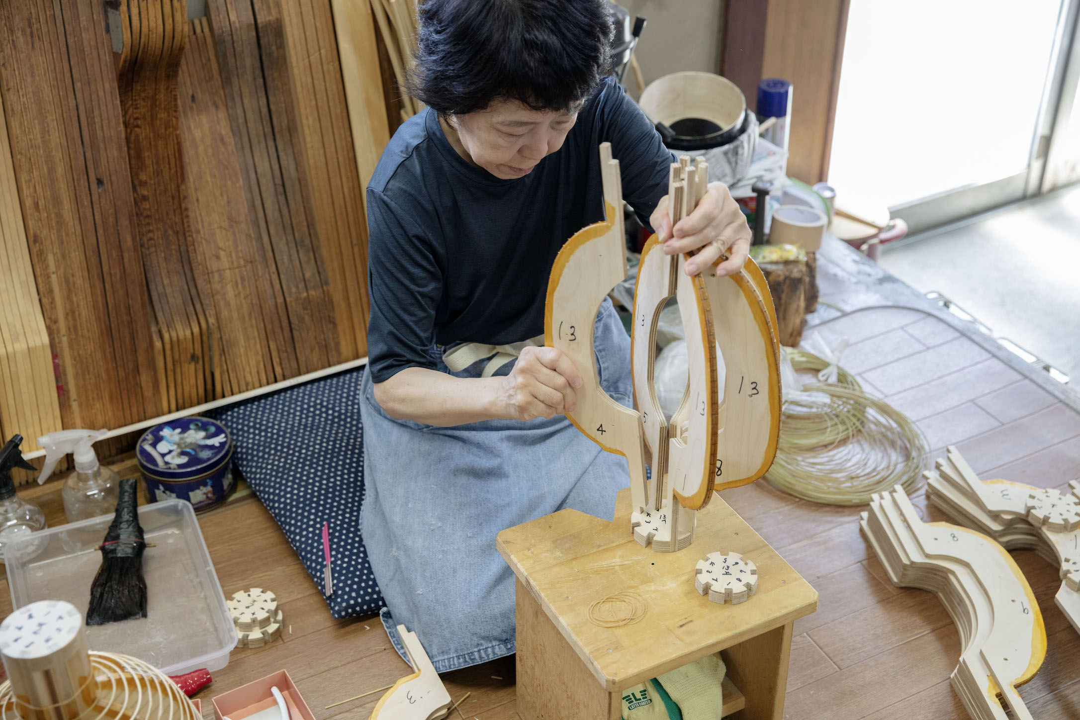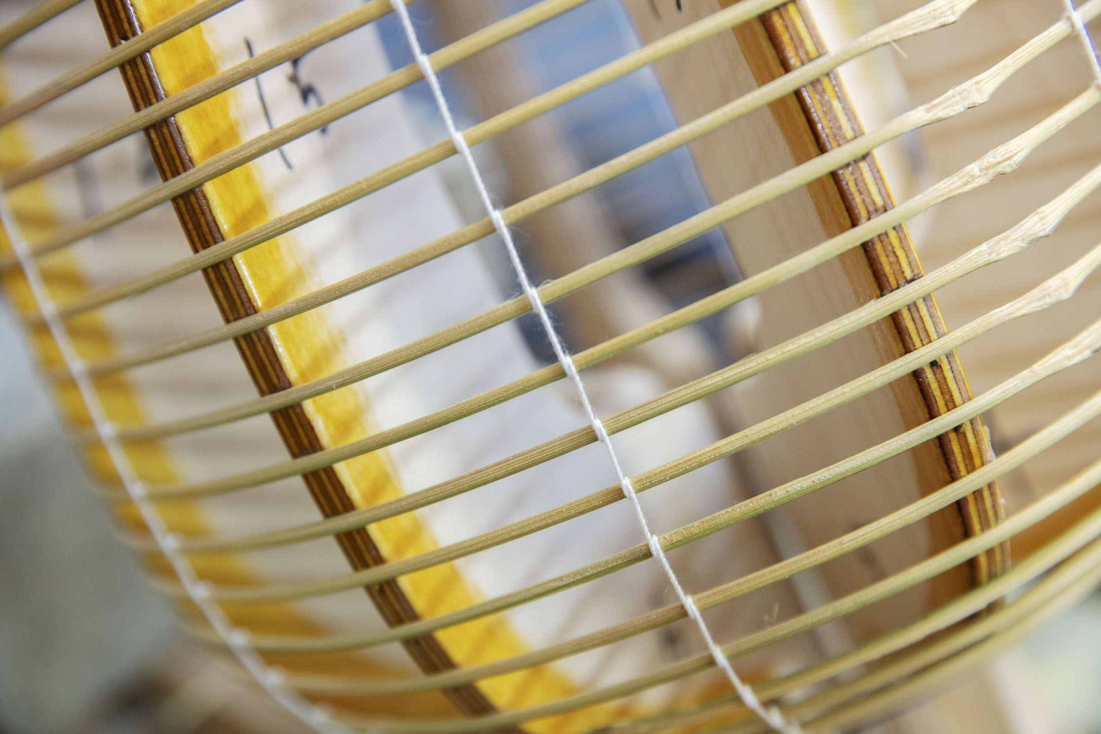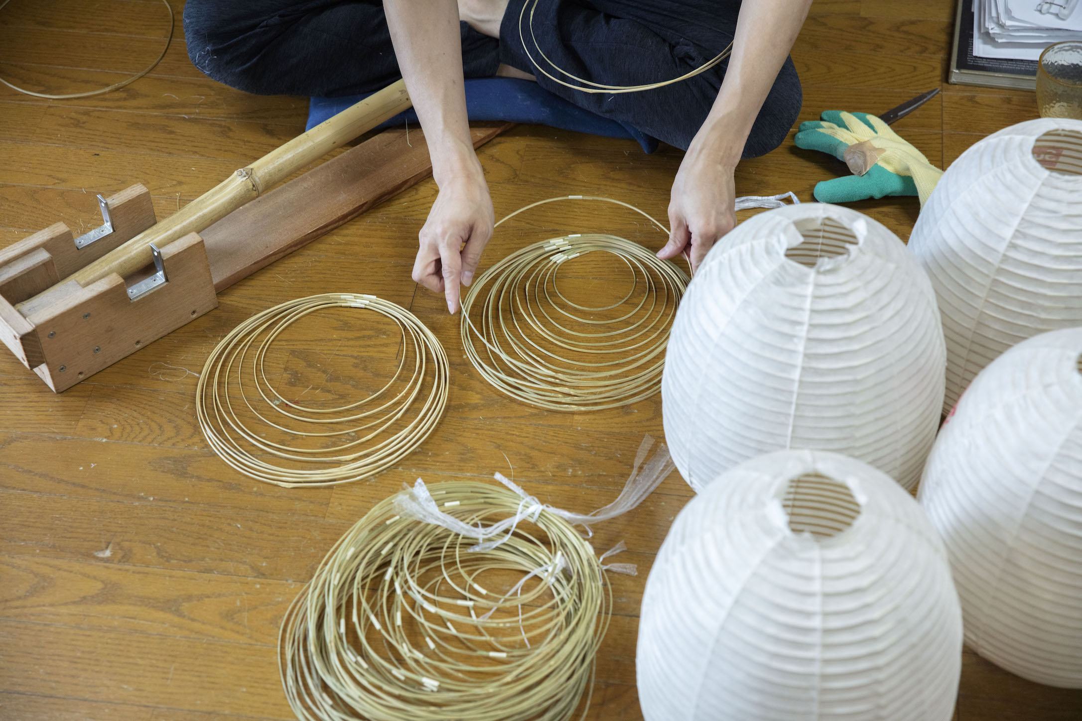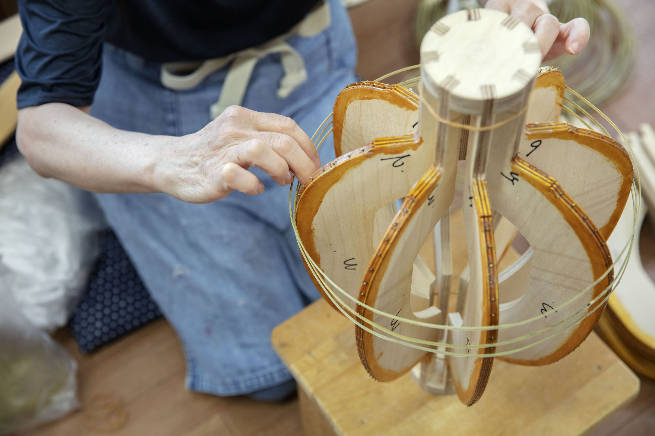 提灯づくりは日本各地で行われてきたが、京提灯の特徴は頑丈で長く使えることだ。だからこそ一時的なデコレーションよりも、室内照明に向いている。その高い強度は、提灯の骨組みの構造に理由がある。一般的な提灯は、断面が丸い1本の竹ヒゴを、螺旋状に巻きつけるように提灯の骨にして、その上に和紙を貼る。それに対して京提灯は、丈夫な皮を残した四角い竹の細棒をまず円形に加工。その輪を木型に並べるようにして提灯の形をつくり、さらに糸でまつってから和紙を貼っていく。ひとつずつわずかに直径の違う竹の輪をつくる作業をはじめ、手間と時間はかかるが、それだけのメリットがあるのだ。