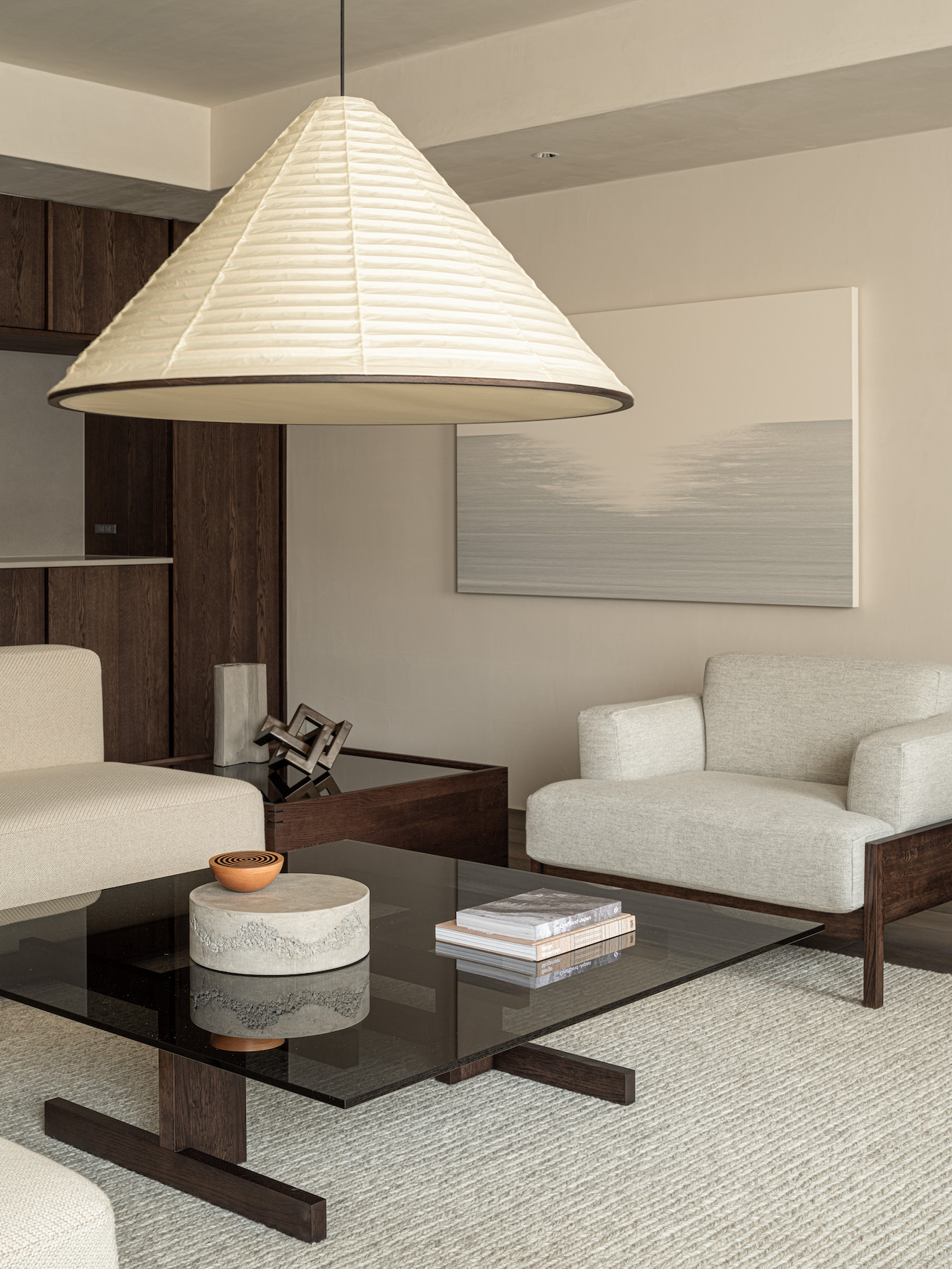 「三角の提灯なんて僕らは考えたことがなかったけど、最初にアイデアを見てこれはおもしろいと思いました。技術的にも問題はなく、カリモクさんも僕らの考えをすぐに理解して対応してくれた。とても楽しい案件になりました」と小嶋 諒さん。この照明は、ノーム・アーキテクツがカリモク家具や建築家の芦沢啓治と進めるカリモクケーススタディの物件「アーキペラゴハウス」や「AZABU RESIDENCE」などに使われ、多くの国際的なメディアで紹介された。発表から約2年が経つが、今も問い合わせが来るという。