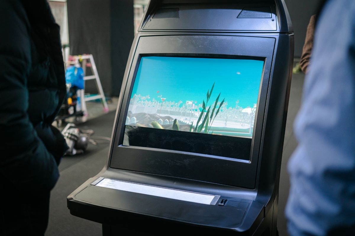 丹原:まさにそうだと思います。従来のキュレーションの定義からすると、相当に攻めてます。でも、だからこそ参加するよと言ってくれたのが、この6名のアーティストなんです。これはゲーム筐体に映し出された4つの映像作品のひとつで、スクリプカリウ落合安奈さんの作品。2021年の「TERRADA ART AWARD 2021 ファイナリスト展」に出品されていた作品《骨を、うめる - one's final home》を再編集されたものです。