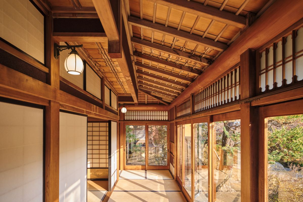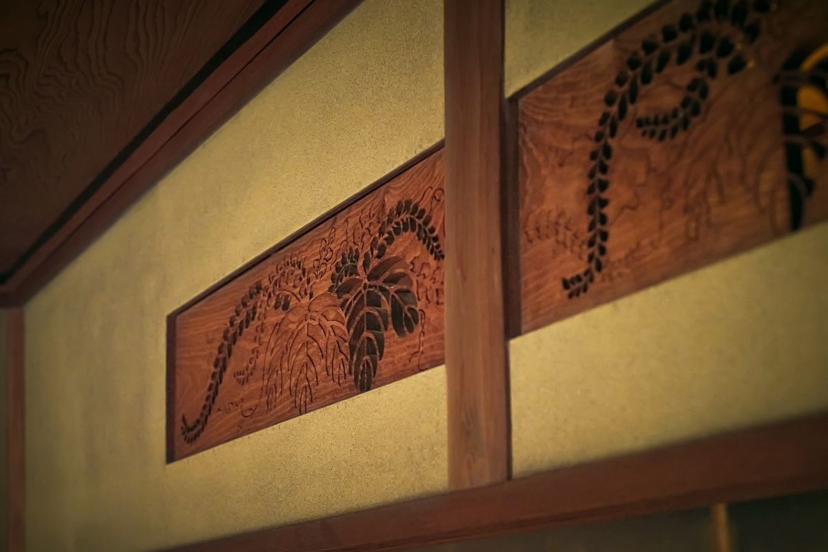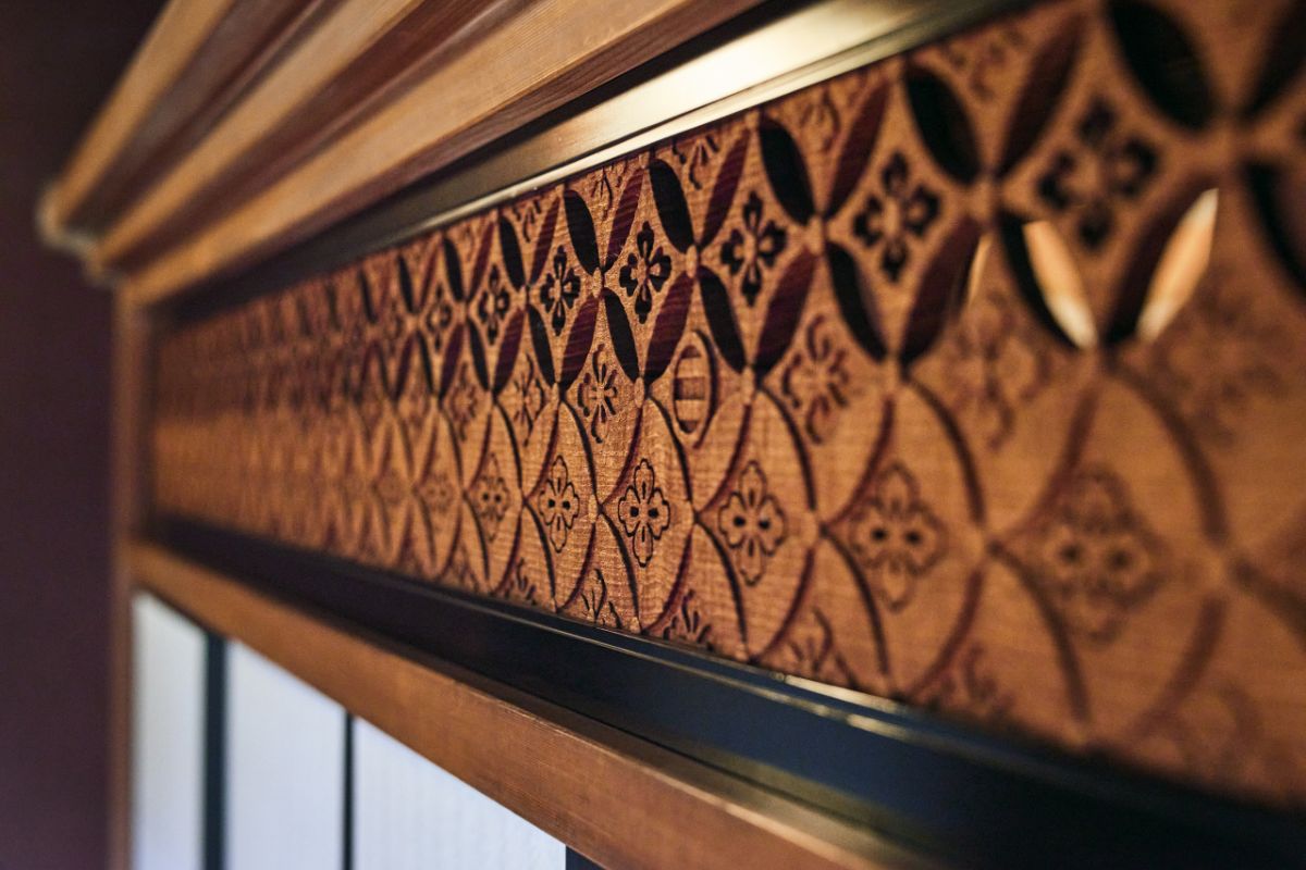 久保木:透かし彫りの名人が厚さ2センチの桐の板を7割ぐらいまで彫ってある。10割彫ったらワンパターンで面白くなくなっちゃうから、あえて3割ぐらいは残している。床の間もそうだし、天井も欄間もやりすぎるとうるさくなるので、意匠は抑え気味にしてあります。お母さんがここで本当に心地よく過ごしていけるようにという心ですね。さらに藤の花も完全に下がり藤ではないんです。家業が証券ですから、下がりは良くない。もっと言うと庭には白梅だけ。紅梅は赤字に通じるから植えない。百日紅(さるすべり)の木もありません。