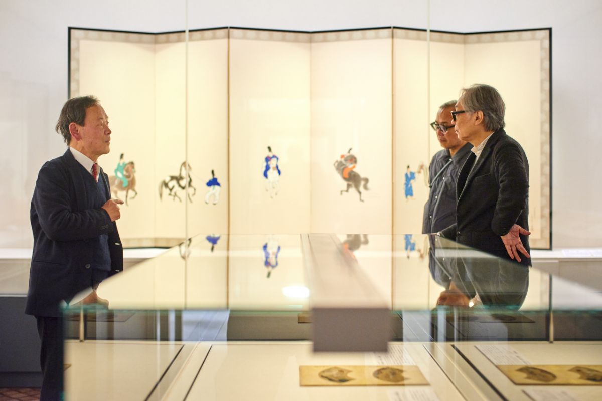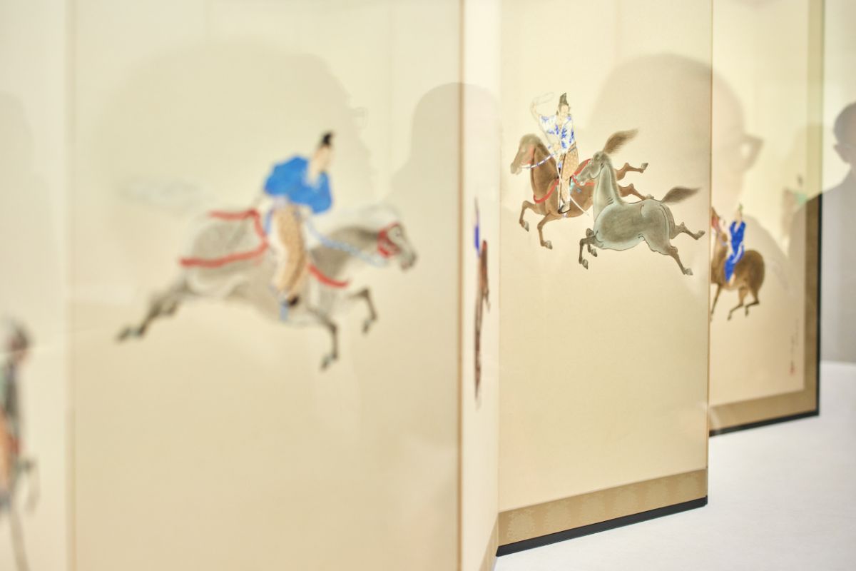 久保木:江戸時代後期の大和絵師、岡田為恭(おかだためちか、別名・冷泉為恭)による《騎馬図》です。六曲一双の屏風になっていますが、実はこれは2年前、土蔵から見つかりました。表具をしていない、まくり状(表装前の書画)の騎馬絵が12枚でした。専門家を交えて協議を重ねた結果、屏風に仕立てて今回公開に踏み切りました。
