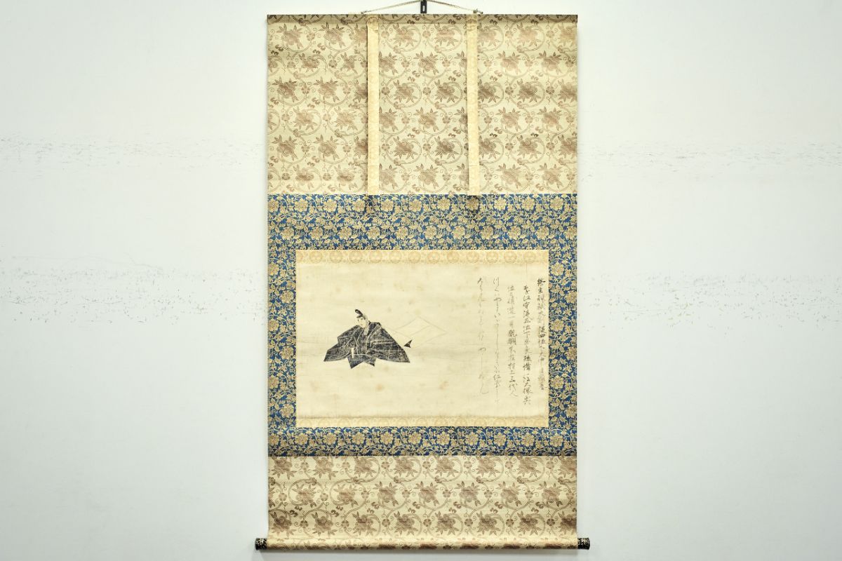 久保木:当館所蔵の「大中臣頼基(おおなかとみのよりもと)」は平安時代中期の歌人です。以後六代にわたって高名な歌人を輩出する大中臣家の祖です。「筑波山 いとど繁きに紅葉して 道見えぬまで 落ちやしぬらむ(筑波山はますます紅葉が盛んになり、道が見えなくなるまで落葉していることだろう)」という歌が頼基像の横に書かれています。