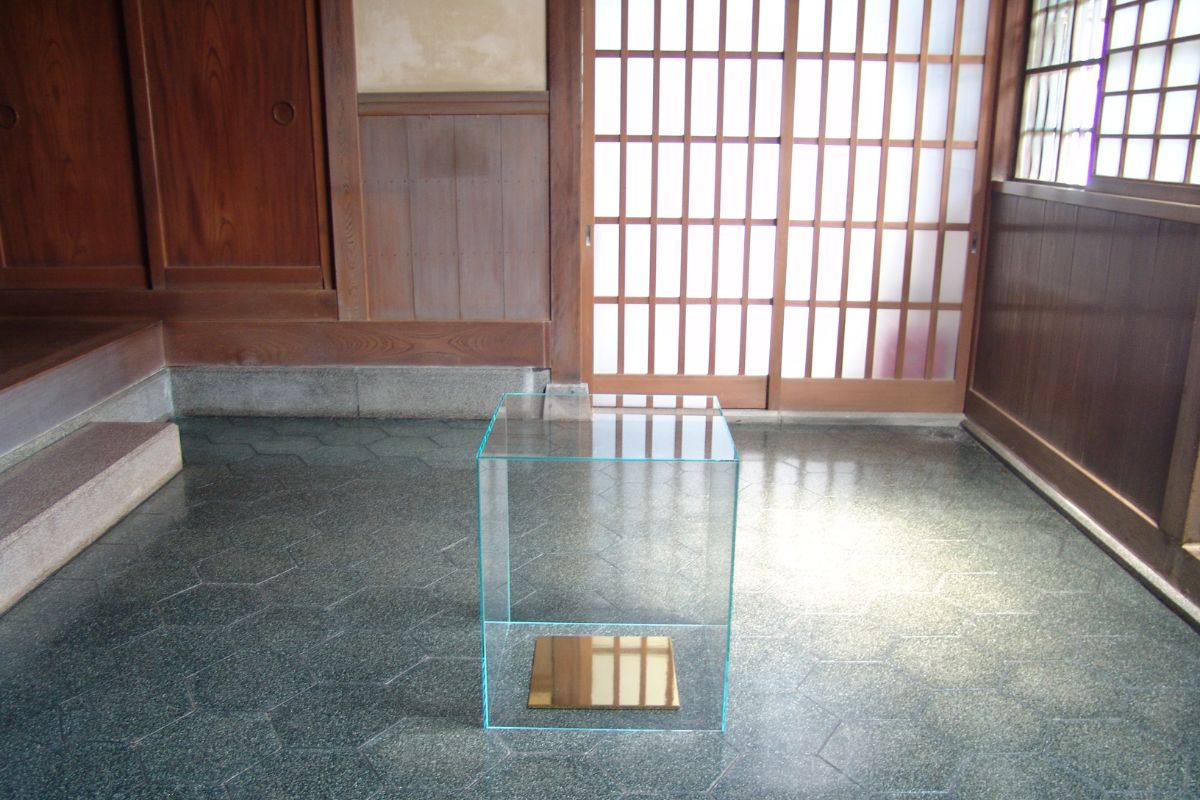 公一:竹岡雄二さんは、ドイツ・デュッセルドルフ在住の彫刻家で、多様な素材を用いて、「台座」の彫刻の制作を続けている作家です。ジェームズ・リー・バイヤーズが金の球《The Sphere of A.P.Q.》を置いた同じ西棟の床の間に、竹岡さんも金色の柱《立っている彫刻》を立てました。