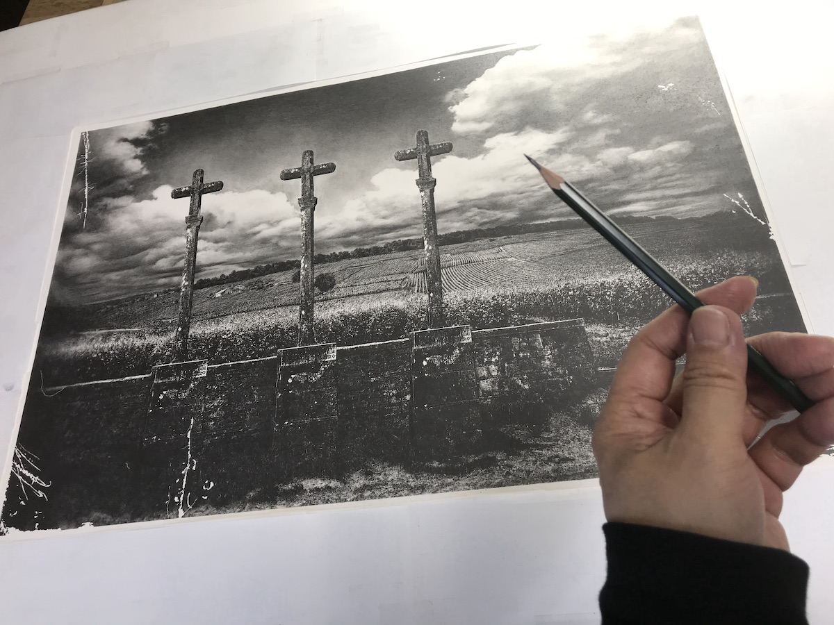 小川:真っ白い紙に描いていくので、どうしても鉛筆が自分の手で擦れてしまいます。なので、全体的に白い紙で覆い、今日描くところだけハサミで扉のように切って、描き終わったらパタッと扉を閉じて次に、というような描き方をしています。それで端から端、上から下って描き終わったら、その上にかぶせていた白い紙を取るんです。