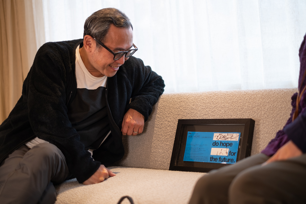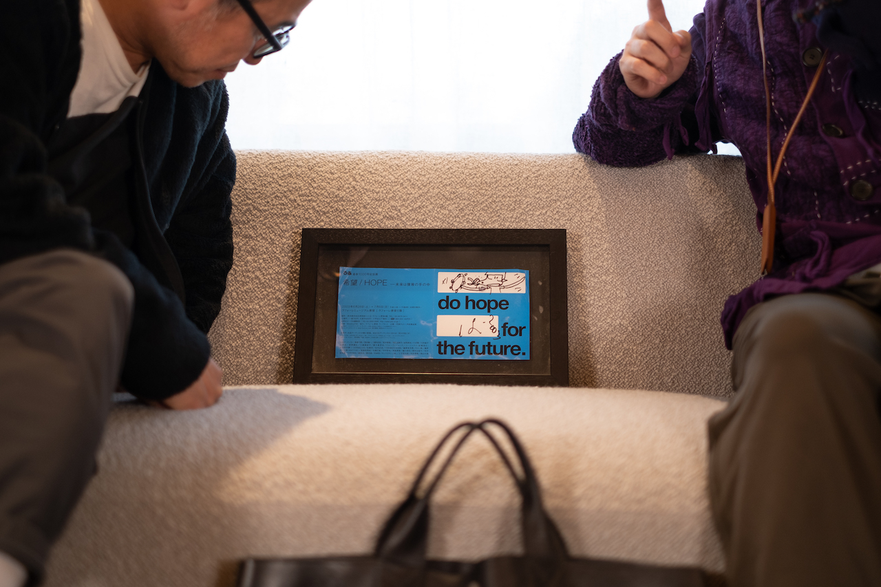 遠山:しかもおあつらえ向きというのかな、いかにもここに描いてくださいって感じで白抜きになってるもんね。みんなが自分の未来に向けてどんな言葉を入れるのか、を意図してつくったんだと思うけど、うまい具合にここに奈良さんの絵とサインが入った。これもケンスケのためだけに描かれたお宝だね。