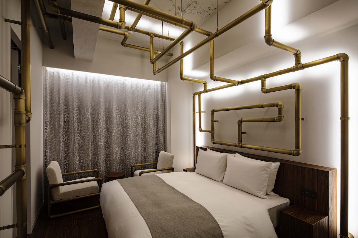鈴木:レアンドロは真鍮色の配管に囲まれた部屋。レアンドロの作品の特徴である彼の作品の中に入って、作品の一部に自分もなるという体験を客室で得られることができます。《Lighting Pipes》と呼応しているような作品ですよね。ホテルがこの部屋に閉じ込められているようにも思えます。