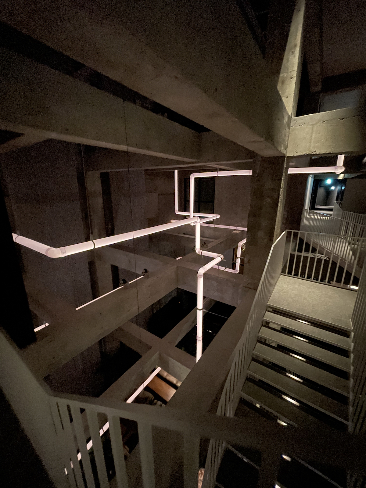 遠山:敷地内にはグリーンタワーという建物も新しくつくられ、こちらにも客室が用意されています。コンクリート剥き出しの無機質なヘリテージタワーに対して、グリーンタワーは小山のような丘のような建物。建物の上にはフィンランド式サウナも設置され、宿泊者一日限定2組だけが楽しめるようになっています。そしてそこには宮島達男さんの作品も設置されている。本当にそこら中にアートが飾られ、建物と一体化してるんですよね。特にヘリテージタワーは建物にアートがないところはないという感じ。