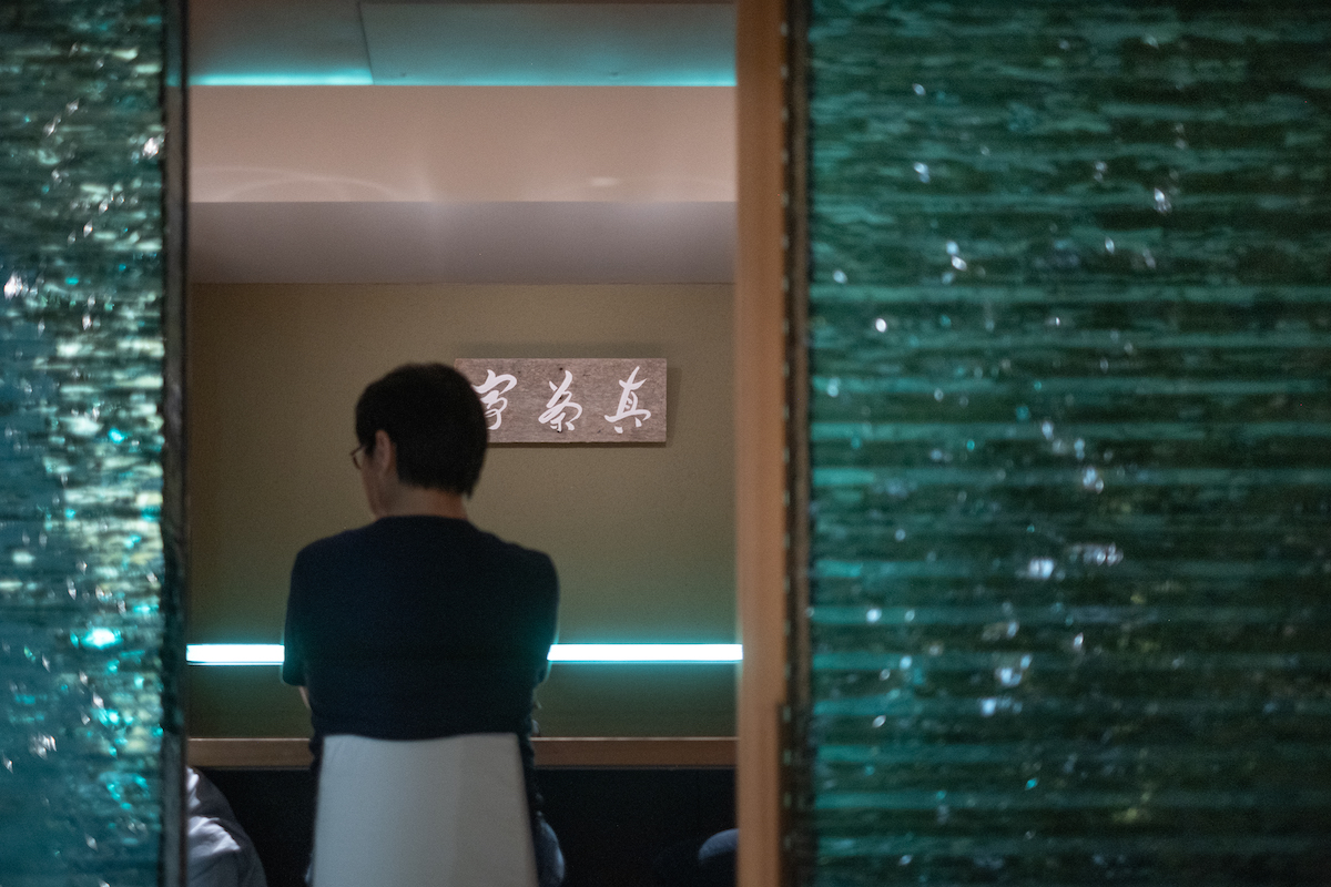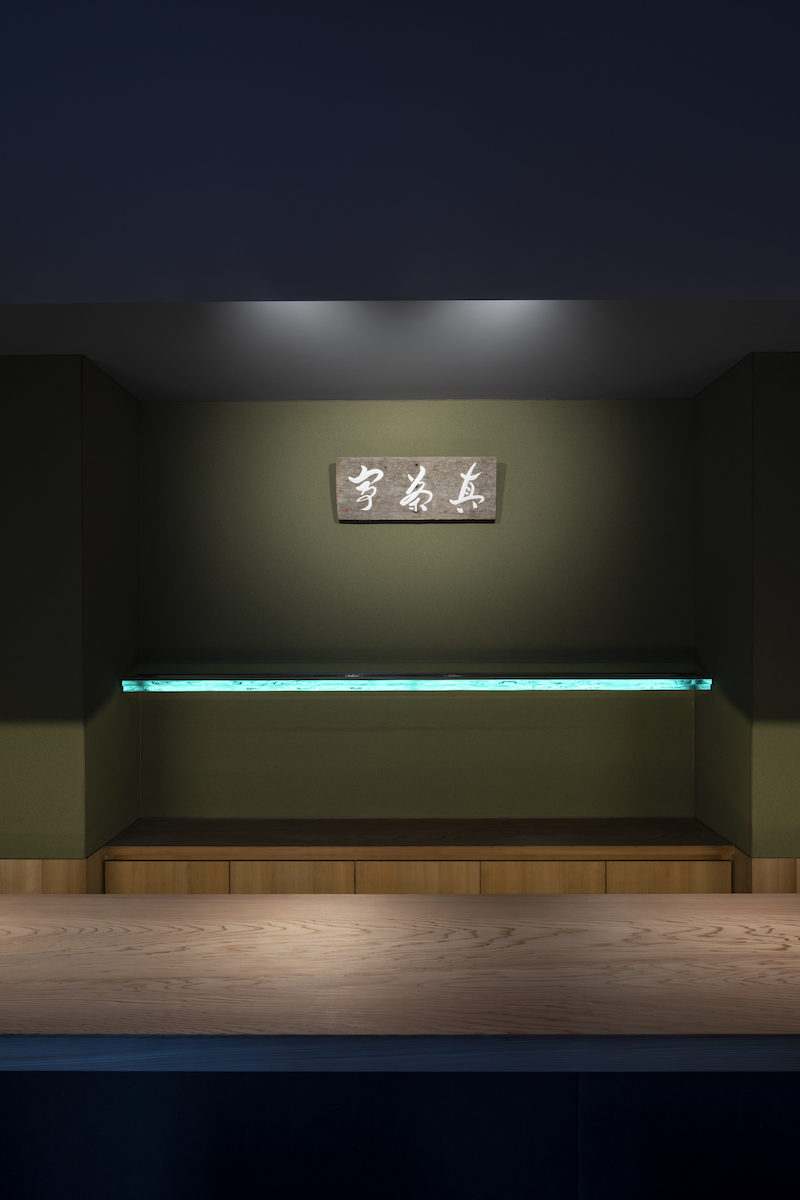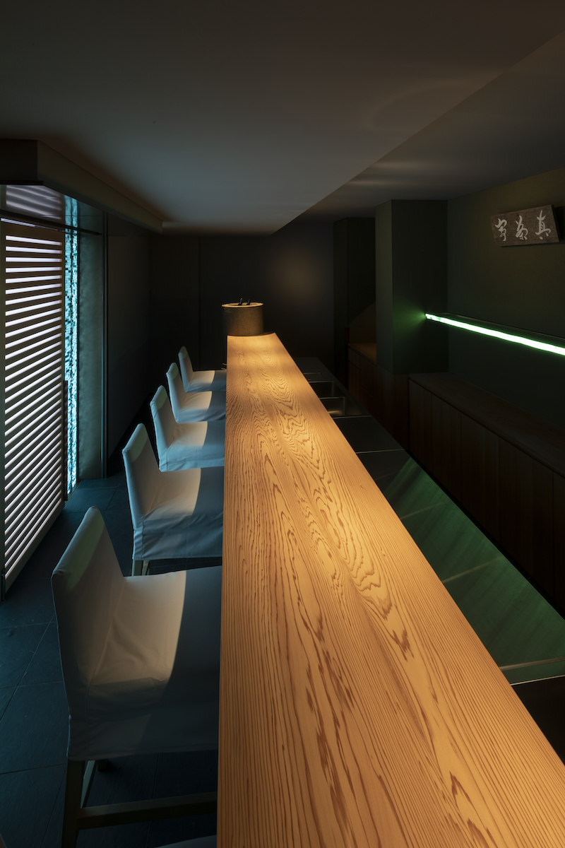 鈴木:杉本さんらしいですね(笑)。この内装の設えも新素材研究所らしいですよね。入って左側には、立ち手水が。これは江戸後期のもののようですが、この手水から水が流れ波紋になるかのように、一枚板の机が置かれている。