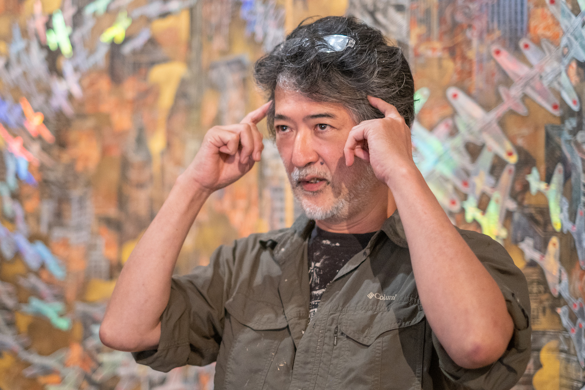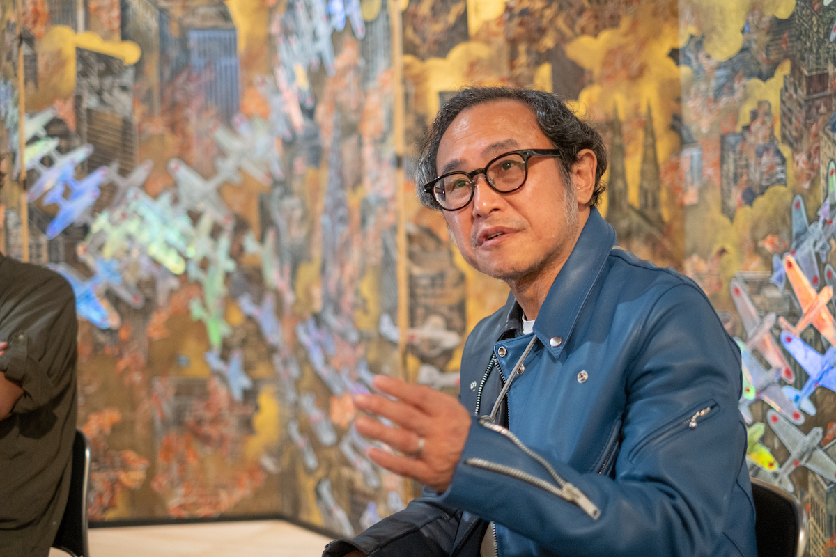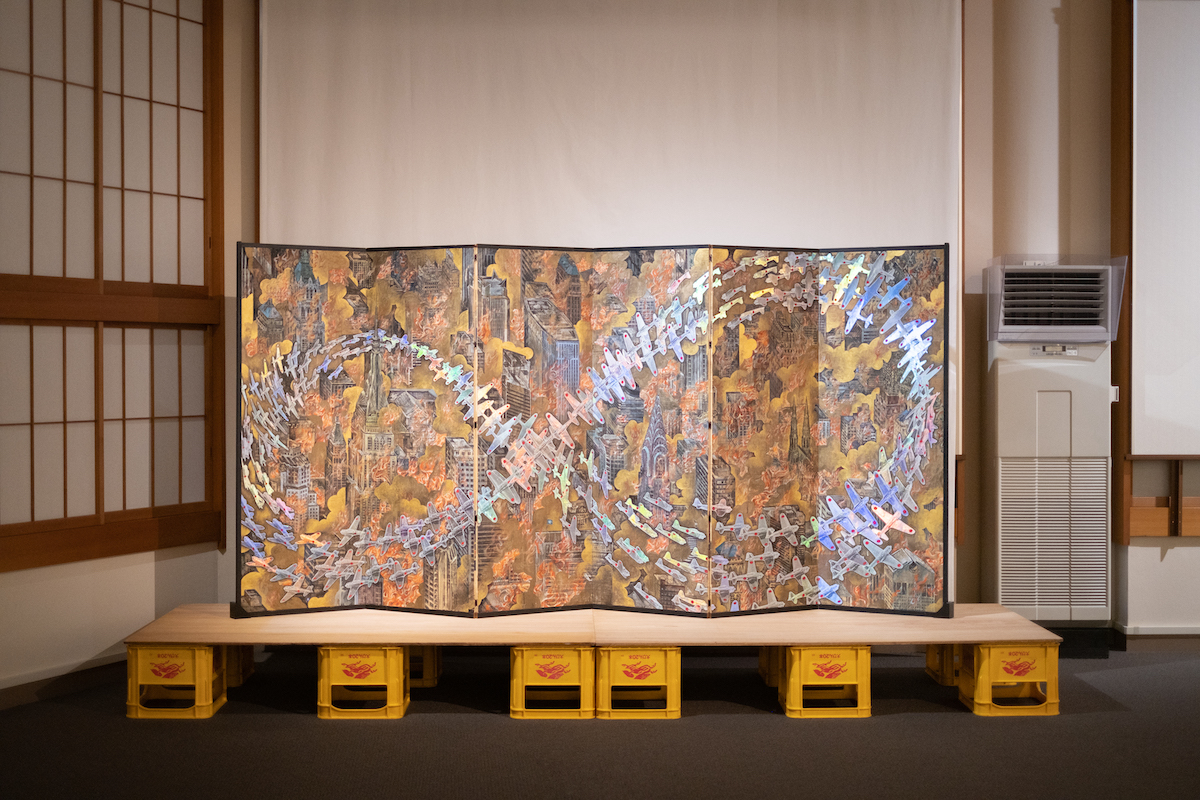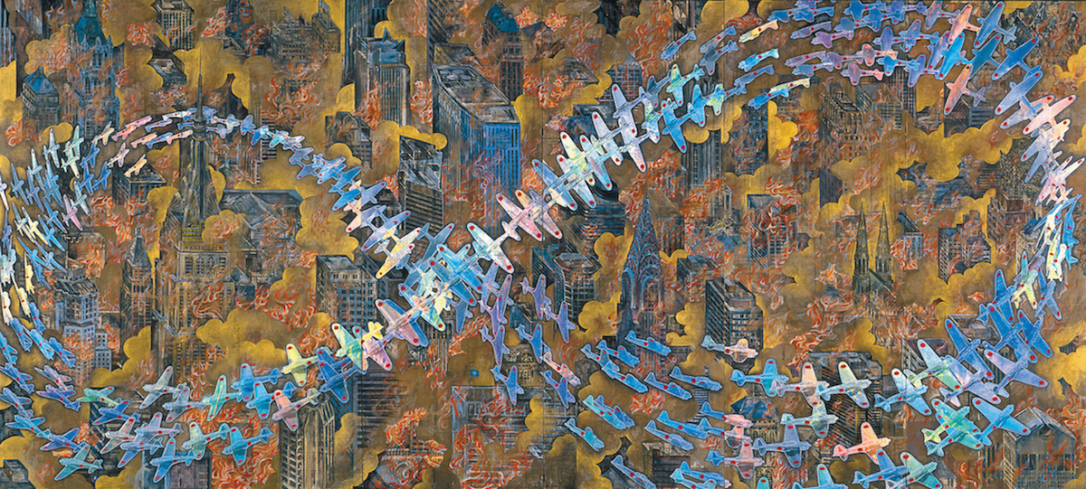 鈴木:これはタイトルのとおり、ニューヨークが燃え盛る場面です。そこに加山又造の鶴が編隊飛行する姿を、零戦に置き換えています。それ以外の要素や、会田さんにとってのアメリカについて教えてください。