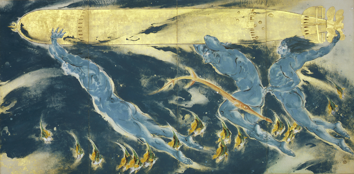 会田:そうですね、《水雷神》(1944年)でしょうか。この作品は戦争画だけど、どこかファンタジー的な要素もあります。魚雷をアメリカの船に撃ち込む場面だけど、それは水雷神と呼ばれる神が撃ち込もうとしています。《香炉峰》とある種同じで、リアルな戦争体験に基づくけれども、リアルさだけではない、龍子ならではの戦争画になっています。この魚雷もハリボテ感がある気がします。