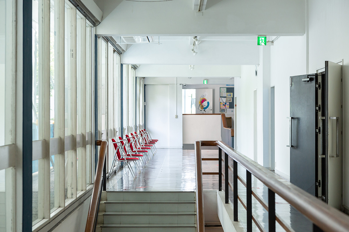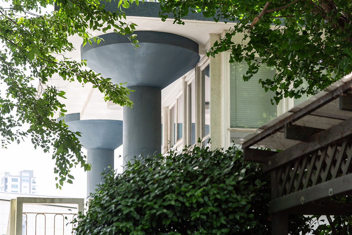 いまも牛込濠を挟んだ向かいの千代田区側にある外濠公園から「アンスティチュ・フランセ東京」を眺めると、建物は丘に浮かぶ白い船のように見える。完成時は周辺に建物も少なく、おそらくその印象がより強かったはずだ。梁のない薄いコンクリート製のフラットな床スラブと建設当時から現存する木製サッシのカーテンウォール。スラブを支えるのは、坂倉自身がその形からフランス語でキノコを表す「シャンピニオン」の愛称で呼んだ柱の数々だ。柱頭部分が膨らんだ柱を、坂倉は後の家具にも応用している。この構成はル・コルビュジエが唱えた「近代建築の五原則」を実現したもののように思う一方、障子や襖が連なる日本の建築をも想起させる。