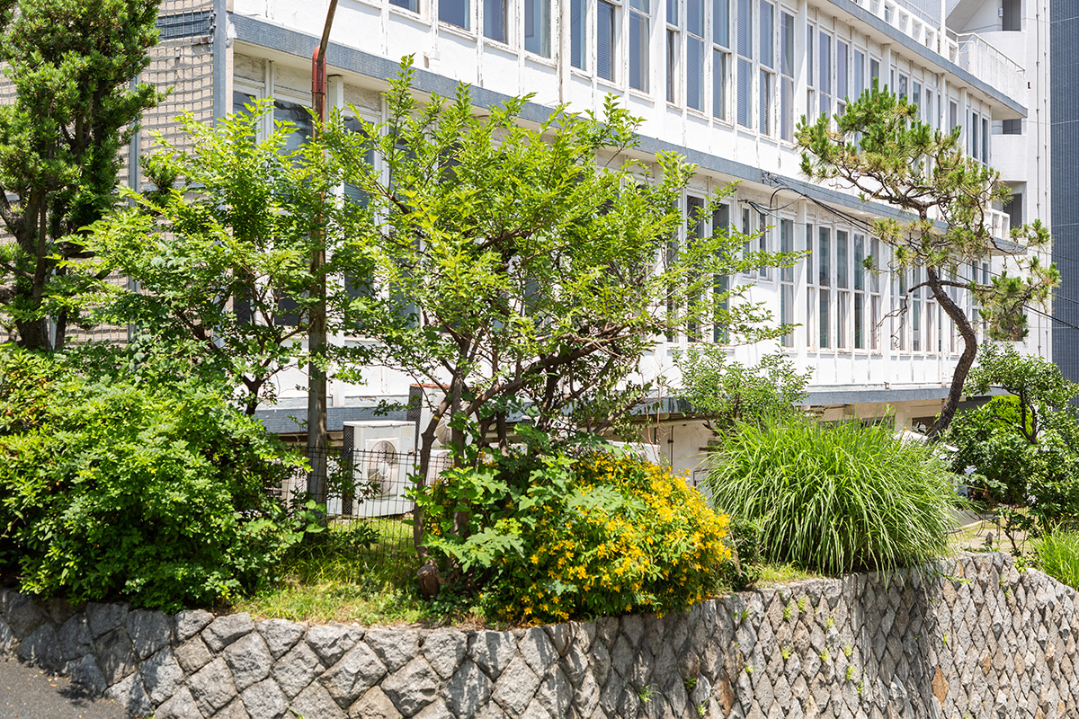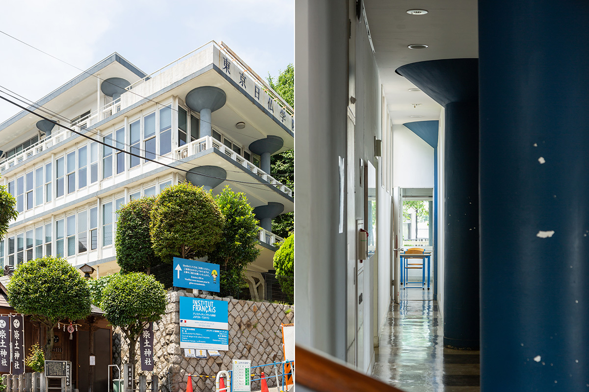 市ヶ谷から飯田橋にかけて江戸城外濠の風景を今に残す牛込濠。それに沿う外堀通りを住宅街へ続く逢坂に向かって左に折れると、「アンスティチュ・フランセ東京」が現れる。施設内の庭園に続く入り口(取材時は工事中のため閉鎖)から石積みの擁壁(ようへき)を見上げると、せり出した屋根とユニークなバルコニーの柱からなるモダンな建物に目を奪われることだろう。逆円錐状に広がる柱頭はギリシアの神殿を思わせ、白い壁に並ぶ柱の青が強い印象を与える。近代建築の巨匠、ル・コルビュジエに師事し、戦後日本の建築を支えた建築家、坂倉準三による名作建築だ。