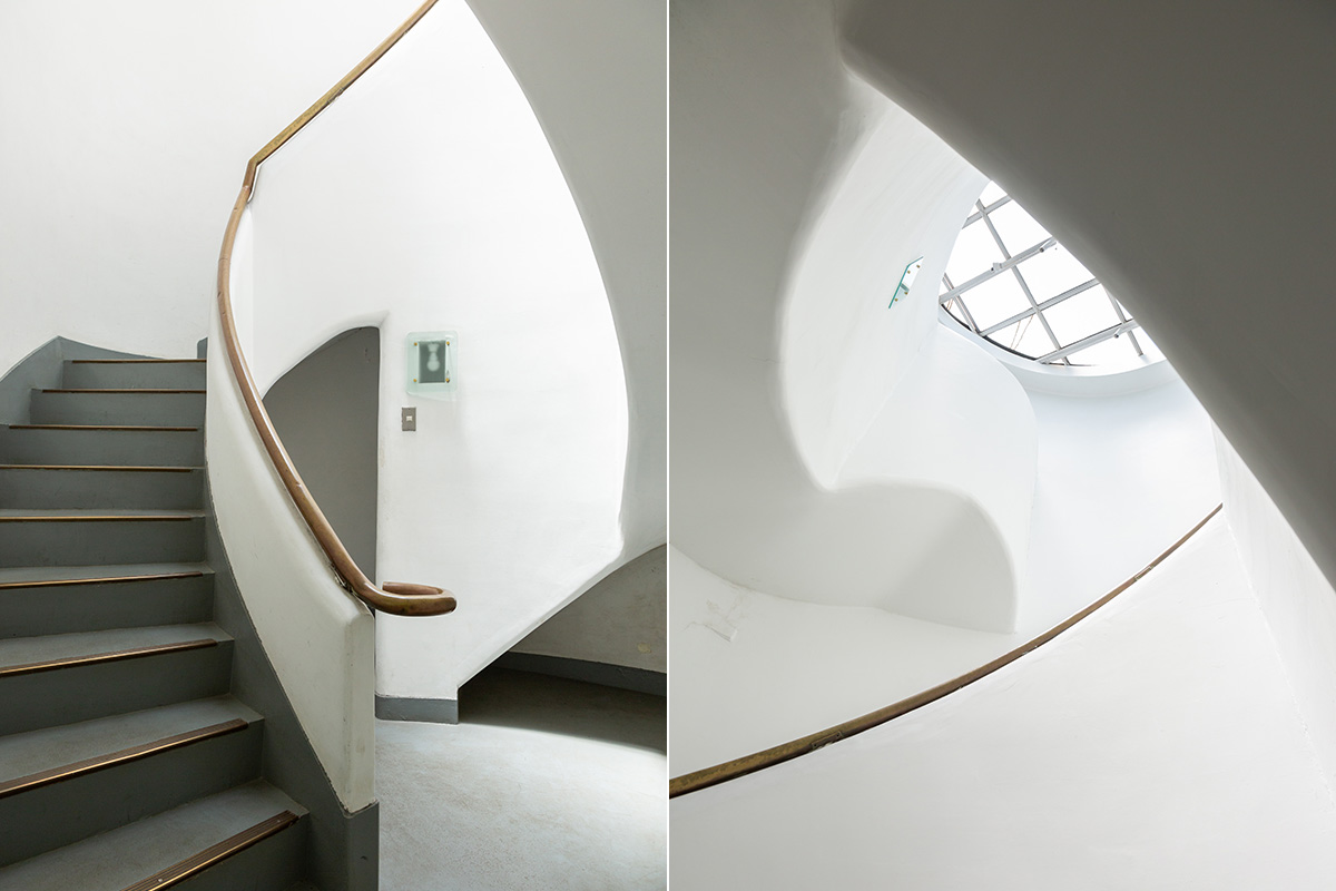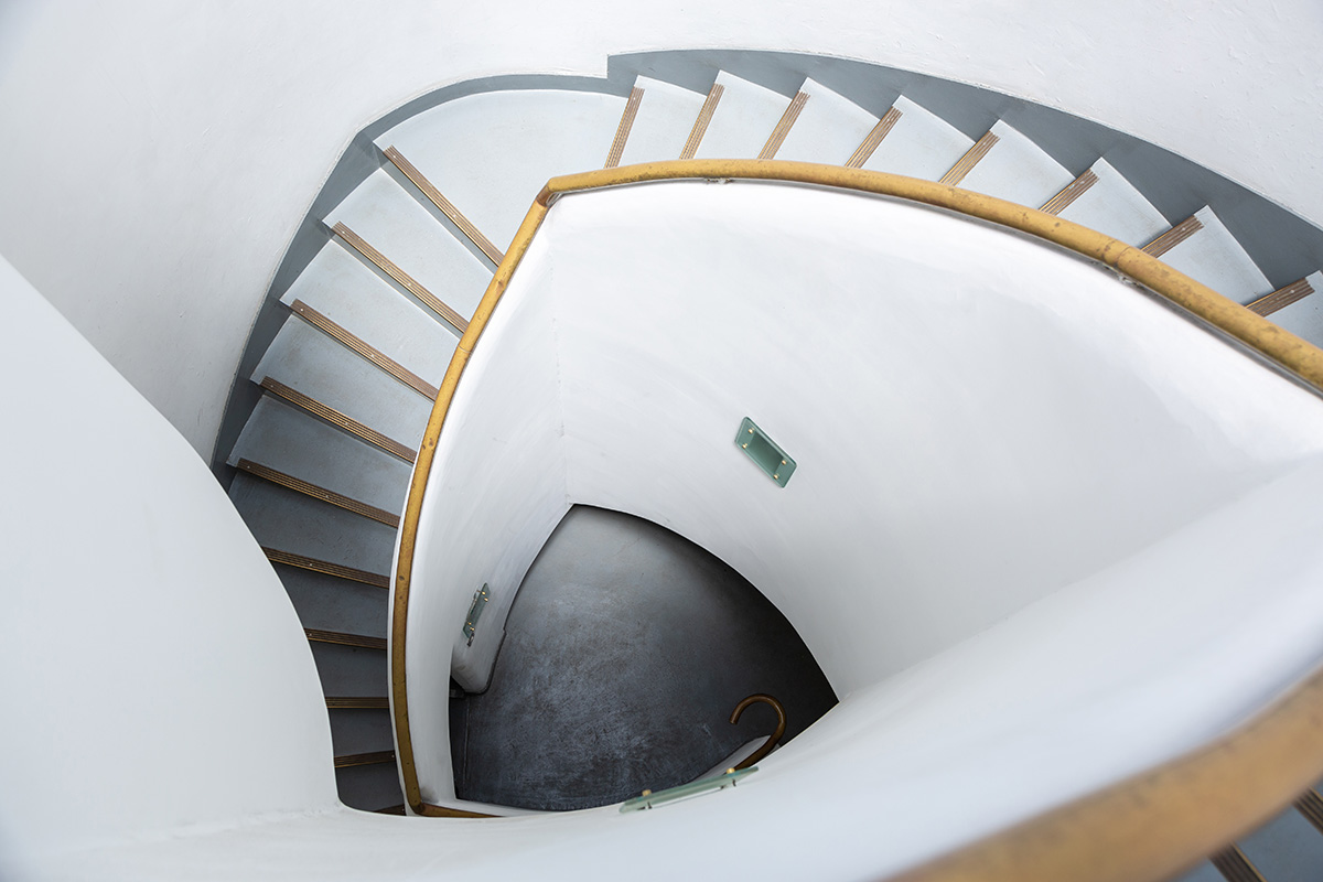 また、この建物で多くの建築ファンを唸らせるのが二重のらせん階段を収めた塔の存在だ。開校当時は最上階に学院長の居住スペースがあったため、生徒が使う階段と分けるために二重の階段を採用したのだろうとされる。上の写真中央の床左手が裏階段への入り口だ。トップライトが差し込む明るい階段の裏にもう一つの階段が隠されているとは、なにも知らなければ気が付かないのではないか。