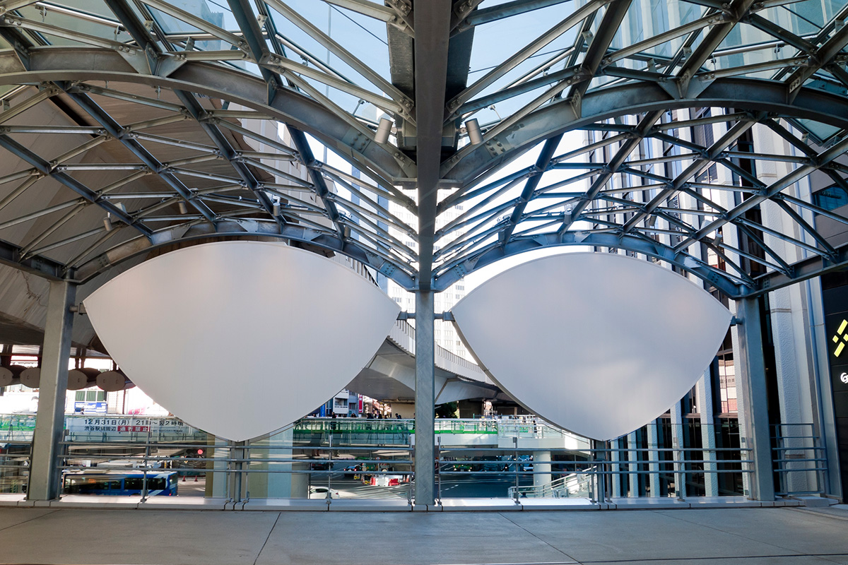 また、角を落とした三角形状の平面形は「おにぎり」や「かまぼこ」を思わせる愛らしいものだが、これは坂倉が設計したかつての東急東横線渋谷駅ホーム上に立っていた目隠し壁とよく似た意匠である。坂倉の建築にしばしば登場する形は現在、「渋谷スクランブルスクエア」と「渋谷ストリーム」をつなぐ通路に再現されている。