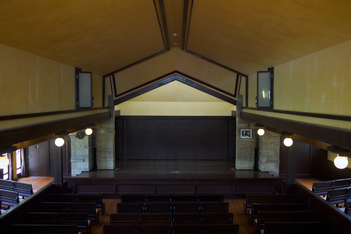 使いながら保存する「動態保存」をしていくため、①オリジナル復原(ホールの窓枠、屋根の銅板葺など)②恒久性を高めるための工夫(鉄骨による構造補強、雨漏り対策など)③活用のための改善(冷暖房設備、照明設備、トイレなど)という3つの大きなテーマのもとに、修理は進められた。