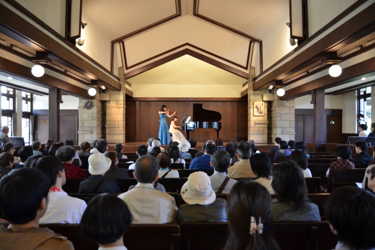 明日館が主催するイベントも、利用者の声を反映させながらバリエーションを広げ、文化財にじかに触れる機会を増やしてきた。2011年から毎月開催されている「ホリデーコンサート」はそのひとつ(2021年6月現在は新型コロナウイルス感染症対策で不定期開催)。月に1度の休日見学日に、誰でも無料で入場できる音楽会を講堂のホールで行うもので、同じ豊島区内の東京音楽大学の学生や若い卒業生が演奏する。「学生にとって一般の人の前で演奏するチャンスは意外に少なく、練習を発表する機会を提供できています。これが好評を呼んで、私たちのホームページで告知する程度ですが、毎回満席になる人気イベントとなりました」と福田さん。