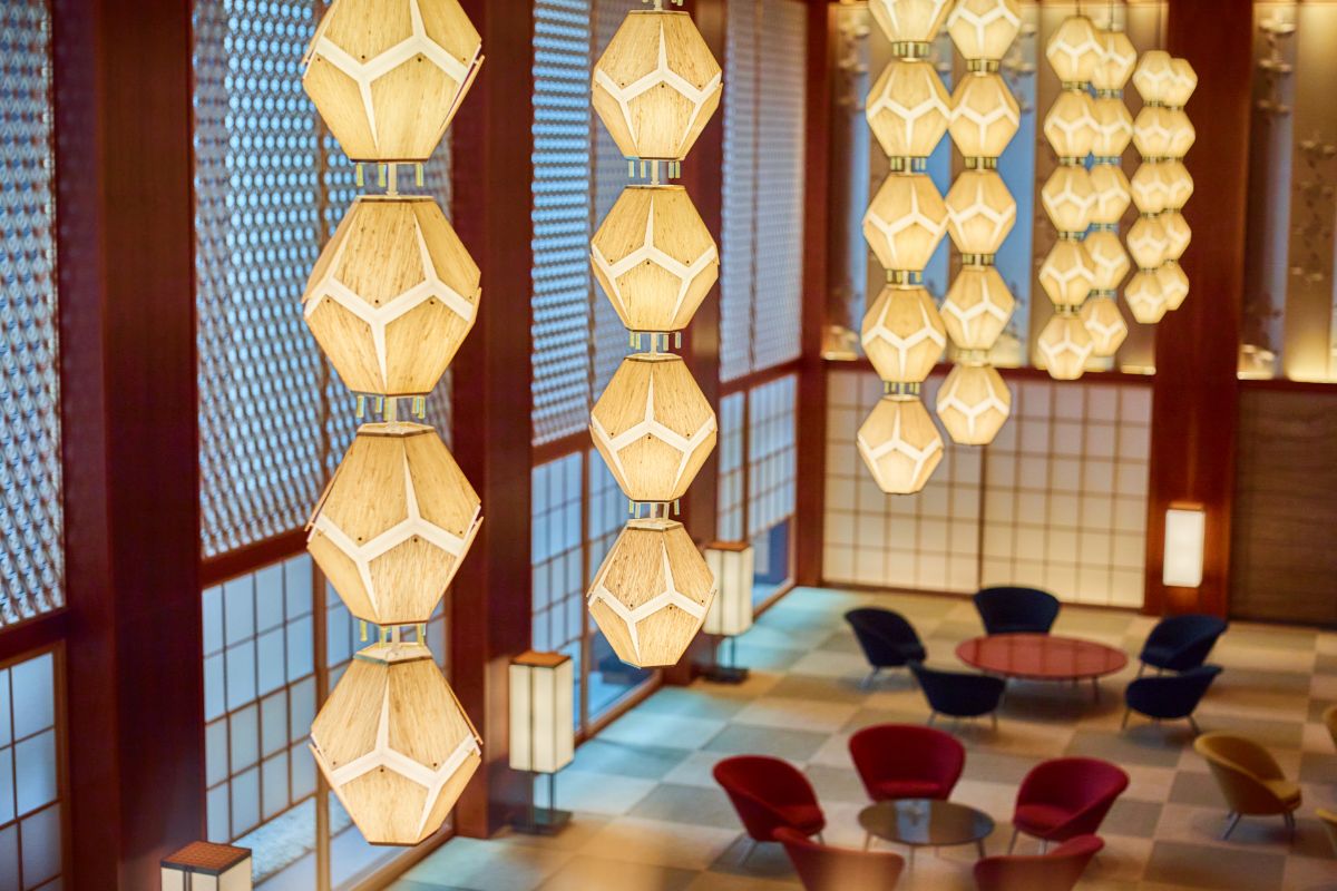 例えば、メインロビー天井から吊り下げられた「オークラ・ランターン」がある。このアイコン的な照明器具は、古墳時代に水晶を多面体にカットして首飾りに使われていた切子玉がモチーフとされたもの。五角形のアクリル板を10枚接ぎ合わせて形作ったランターンを、縦に5つ連結したものが一連となる。再現にあたっては、外側のパネルは以前のものを再利用する一方で、内側のアクリル板と吊り部材は再製作して安全性を高めた。ランプは白熱灯からLEDに替え、昼夜の時間帯によって光のトーンを切り替えることで、往時と同じ風情のある光を実現している。