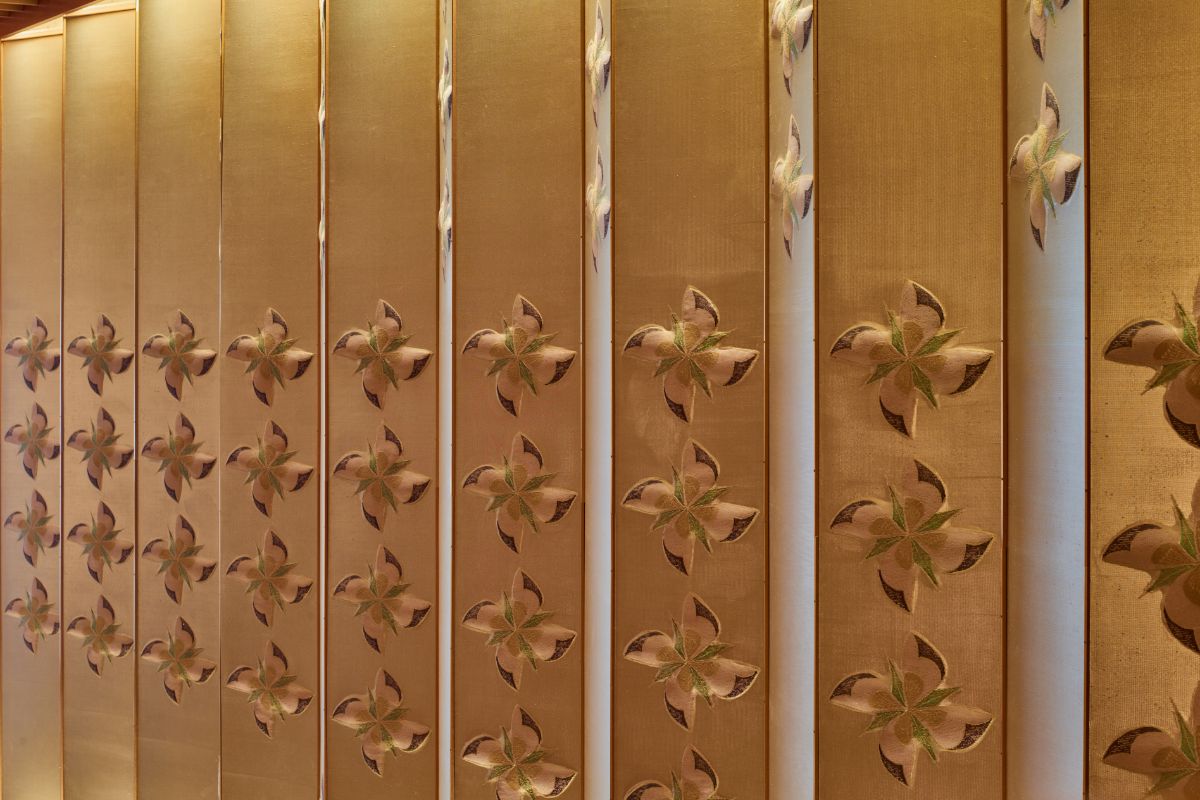 日本固有の蘭をモチーフにし、オリジナルと同じく京都西陣の龍村美術織物に依頼した四弁花文様の壁面装飾の修復では、あえて少し黄色がかった糸で織るなどの調整が加えられている。