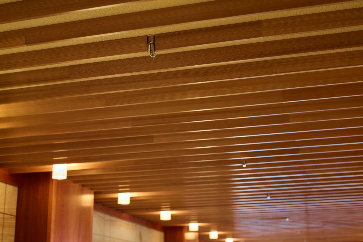 またロビー空間の窓面上部を覆う「麻の葉文様の美術組子」は、繊細な木の部材を手作業で組み込んだもの。当時の制作会社が不明で、途中の改装で手直しをした岡山県の佐田建美に依頼して修復したところ、骨格となる組子よりも「三つ組手(みつくで)」と呼ばれる三叉状のパーツが3mm低く組み入れられていることが判明。加えて文様を90度回転させることで、柱などの垂直ラインに対して水平の線が強調されていた。これは、ロビーでくつろぐ客が見上げることを考慮したものであり、同時に、外からの自然光を庇のように柔らかく調整する役割が持たせられていることが推測された。