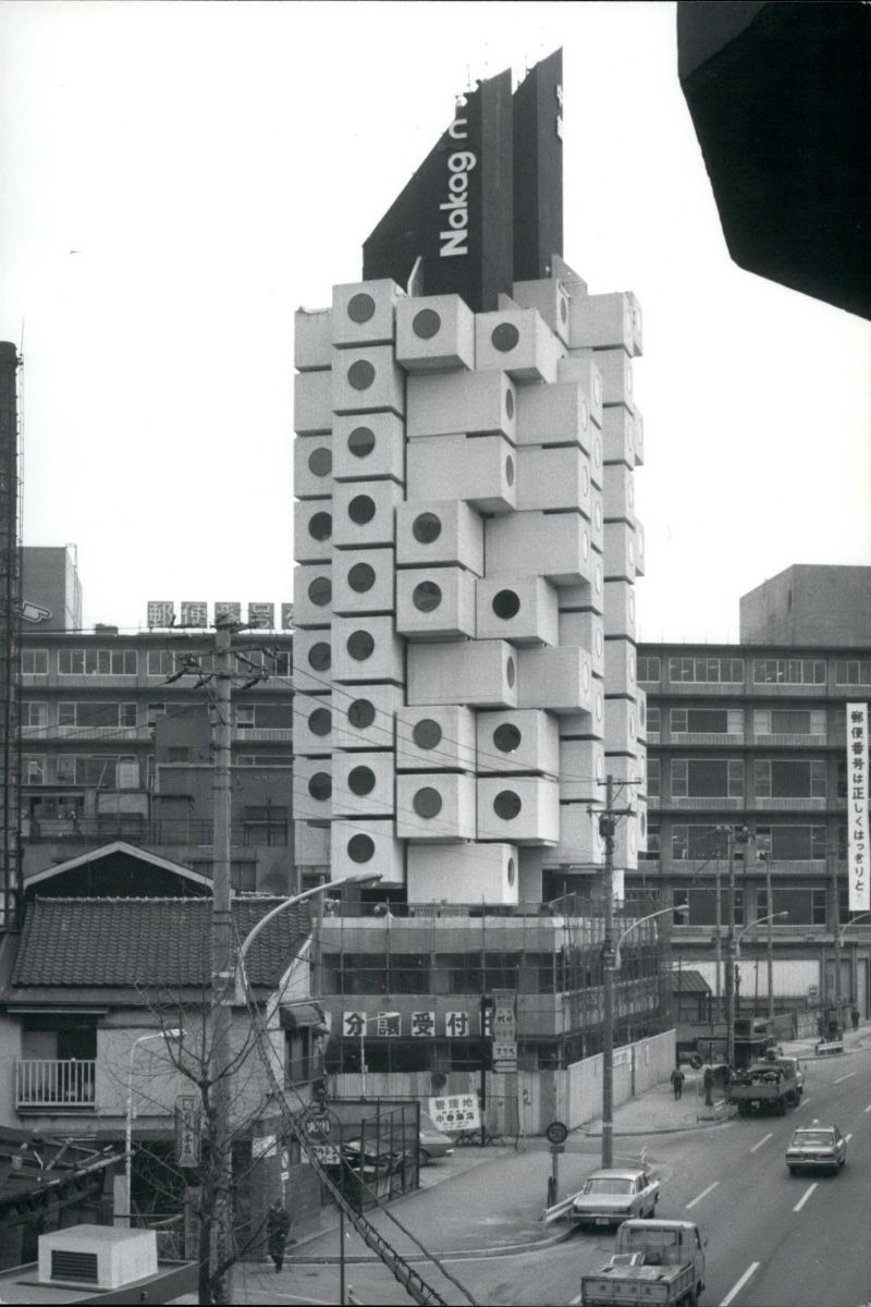 黒川は「カプセルは建築の土地からの解放であり、動く建築の時代の到来を告げるものである」とも宣言していた。個々のカプセルは、軽量鉄骨を用いて工場であらかじめ量産。現地までトラックで搬送され、空に向かって垂直に伸びる2本の巨大な支柱に対して、各階に一つ一つ向きを変えながら取り付けられた。カプセルは互いの壁を接することなく、すべて独立した状態である。