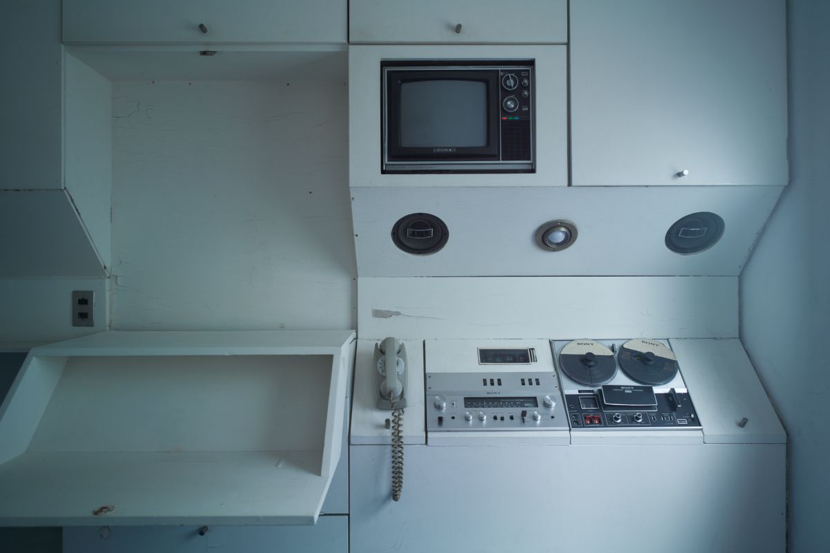 カプセル内部が6畳ほど、バスルームを除くと約4畳半という大きさは、一人で過ごすには必要にして十分な広さである。壁面の造り付けの収納には、折り込み型デスクユニットやエアコンユニット、ベッドのオーバーヘッドコンソールにはカラーテレビやデジタル時計が備え付けられていた。オプションでは、デスク照明と計算機、オープンリールのオーディオデッキとステレオスピーカーも組み込むことができたという。最先端のテクノロジーに囲まれながら、銀座の街の上空に浮かぶ生活は、刺激的で高揚感のあるものであったに違いない。