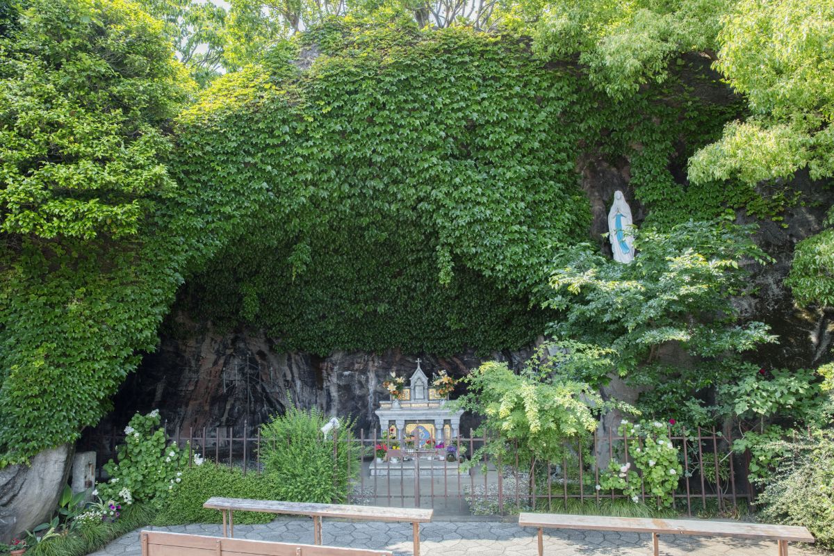 教会の入り口へと至るアプローチもまた、独特のもの。ヨーロッパの教会建築は開けた広場とセットであることが一般的であるが、東京カテドラル聖マリア大聖堂は限られた敷地面積のなかで工夫が凝らされている。目白通り側から見えるのは教会の側面で、アプローチの小さな広場から左手にある「鐘塔」に向かって建物に沿って進んでいくと、「ルルド」という祈りの場が見えてくる。そこから右に向きを変えると、教会の入り口がようやく現れる。